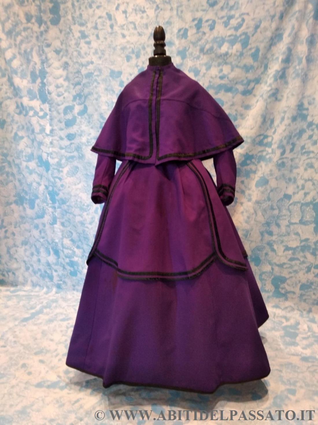 1871 MANIFATTURA AMERICANA:ABITO DAPASSEGGIO O DA VIAGGIO IN TRE PEZZI,COMPOSTO DA ABITO INTERO, TABLIER EMANTELLINA, REALIZZATO IN LANA E SETA DI COLORE VIOLA, PROFILATO DA BORDI DI RASO NERO.