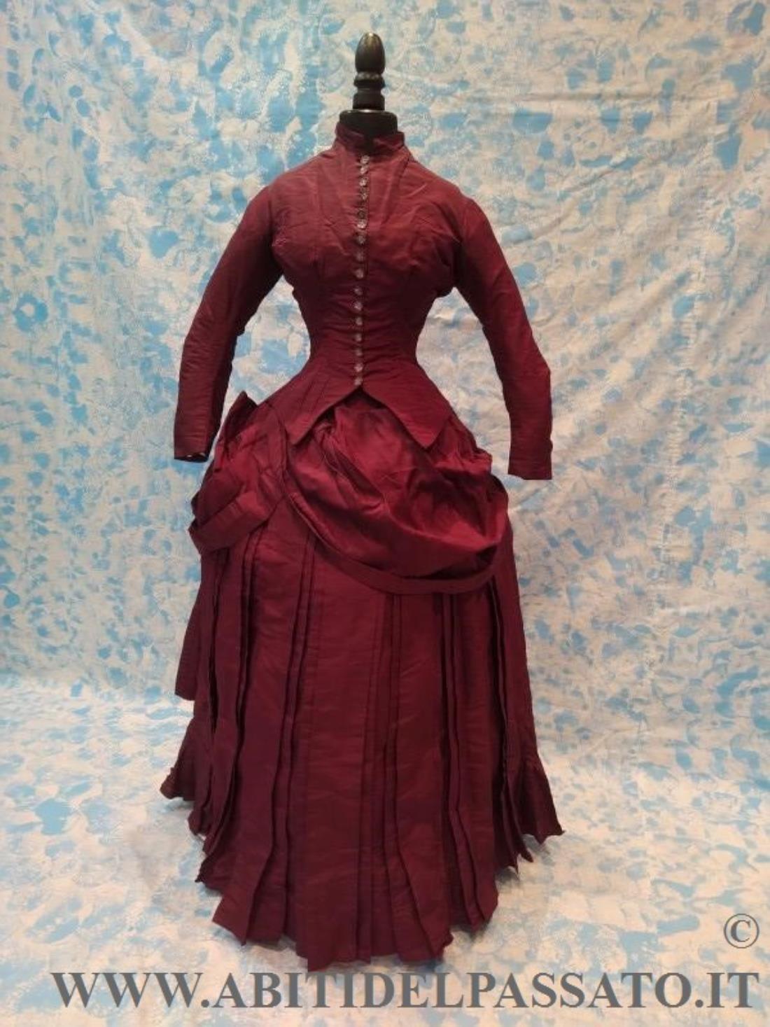 1884-85 MANIFATTURA AMERICANA, PROVENIENZA N.Y. ABITO FEMMINILE DA GIORNO REALIZZATO IN SETA COLOR VINACCIA, COMPOSTO DA CORPINO E GONNA, CONDIZIONI ECCELLENTI.