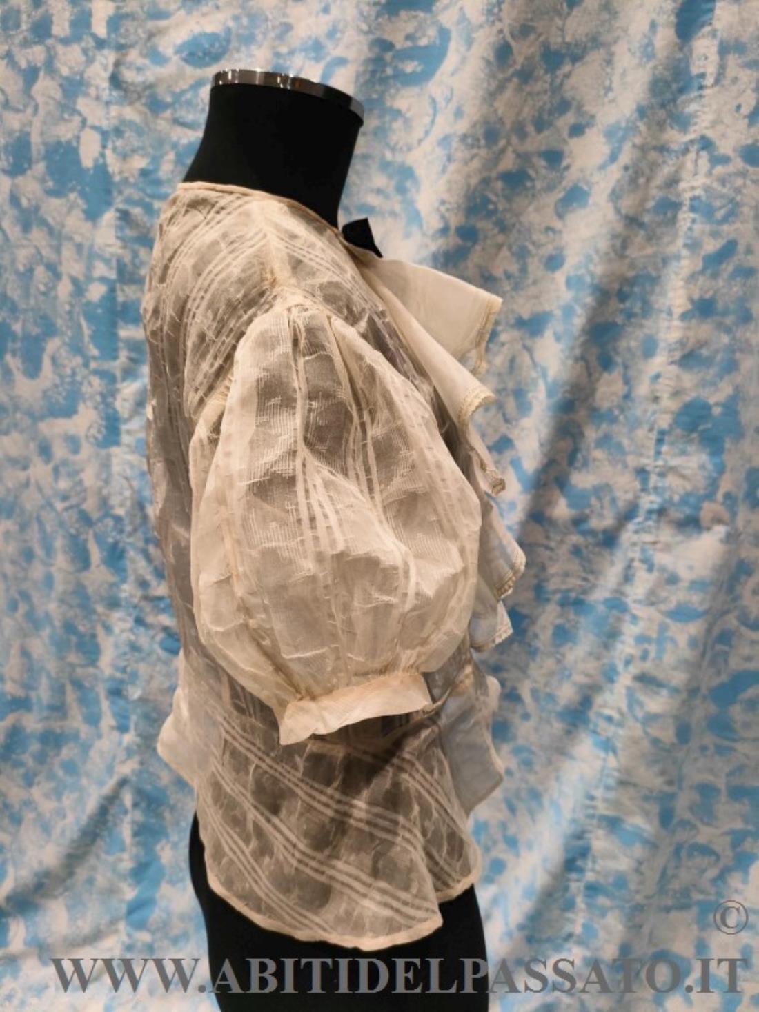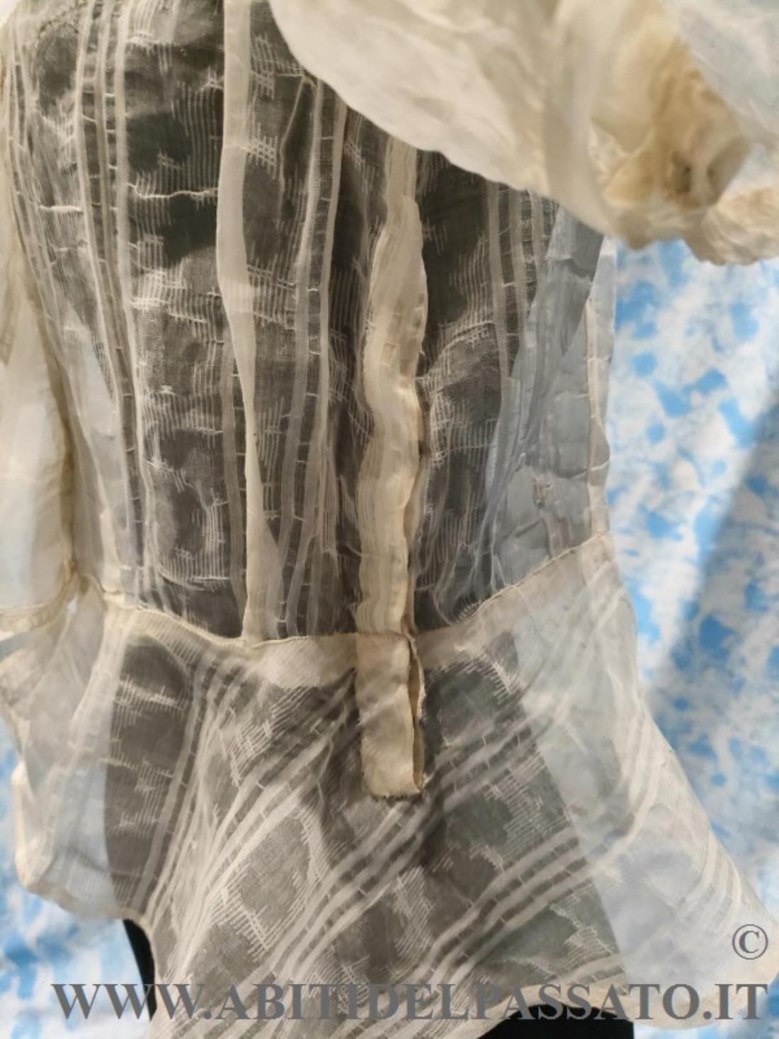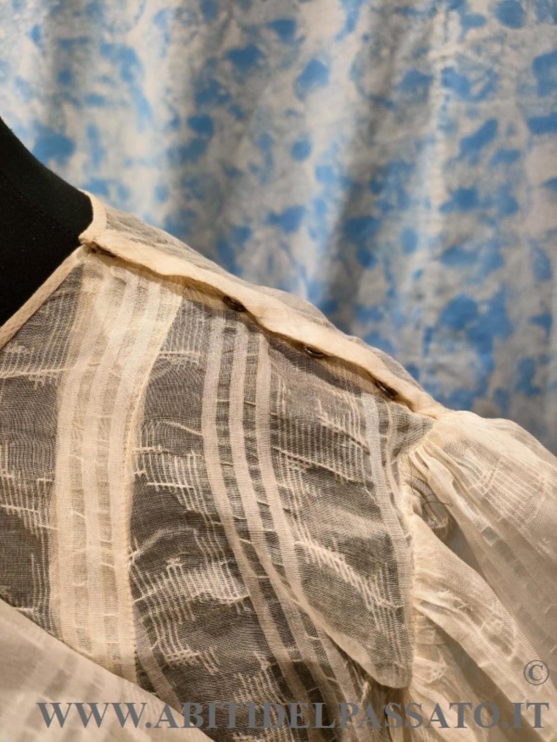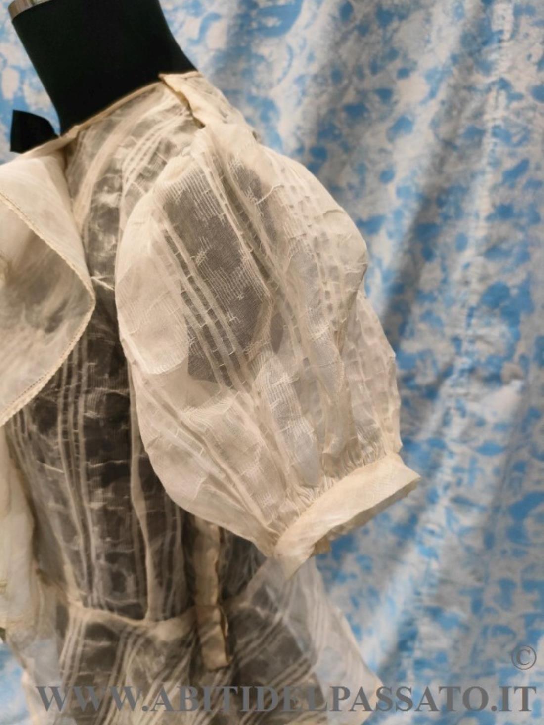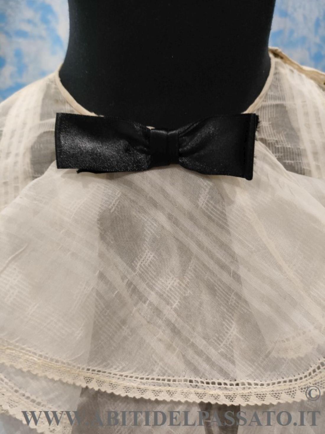 IL CAPO PRESENTA MANICHE CORTE A PALLONCINO ED E' TAGLIATA IN VITA CON BASCHINA SEMI SBIECA. APERTURA SU SPALLA E IN ENTRANBI I FIANCHI TRAMITE BOTTONI AUTOMATICI. DECORATA DA UNA GRANDE BALZA, APPLICATA NELLA PARTE FRONTALE E TERMINANTE CON PICCOLA PASSAMANERIA, E DA UN PAPILLON DI RASO NERO.