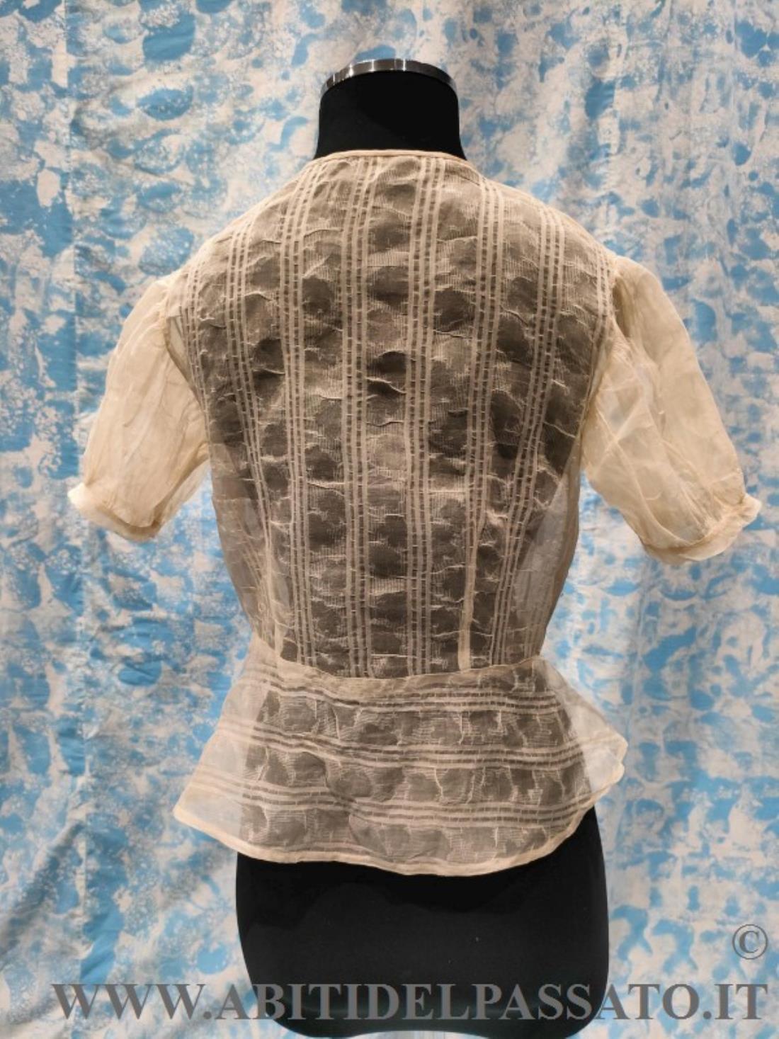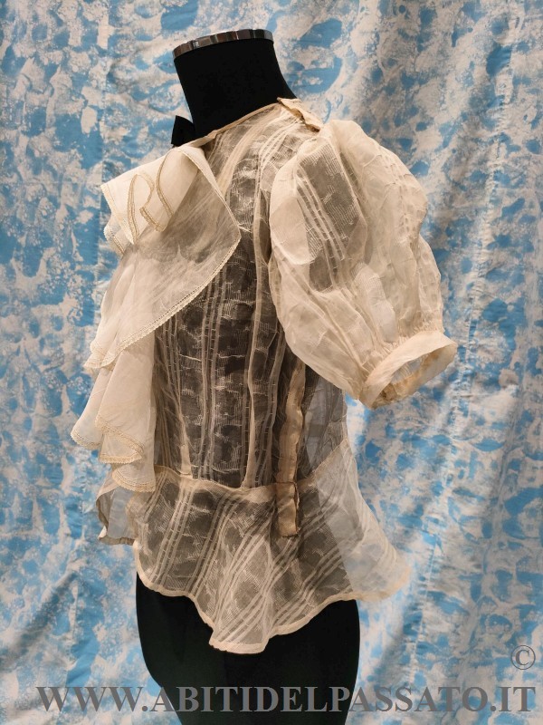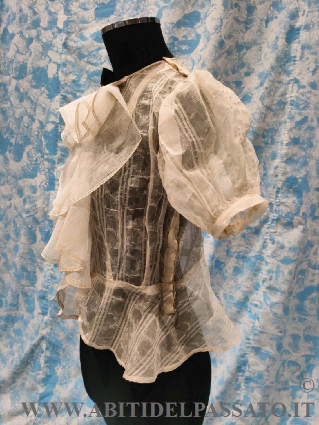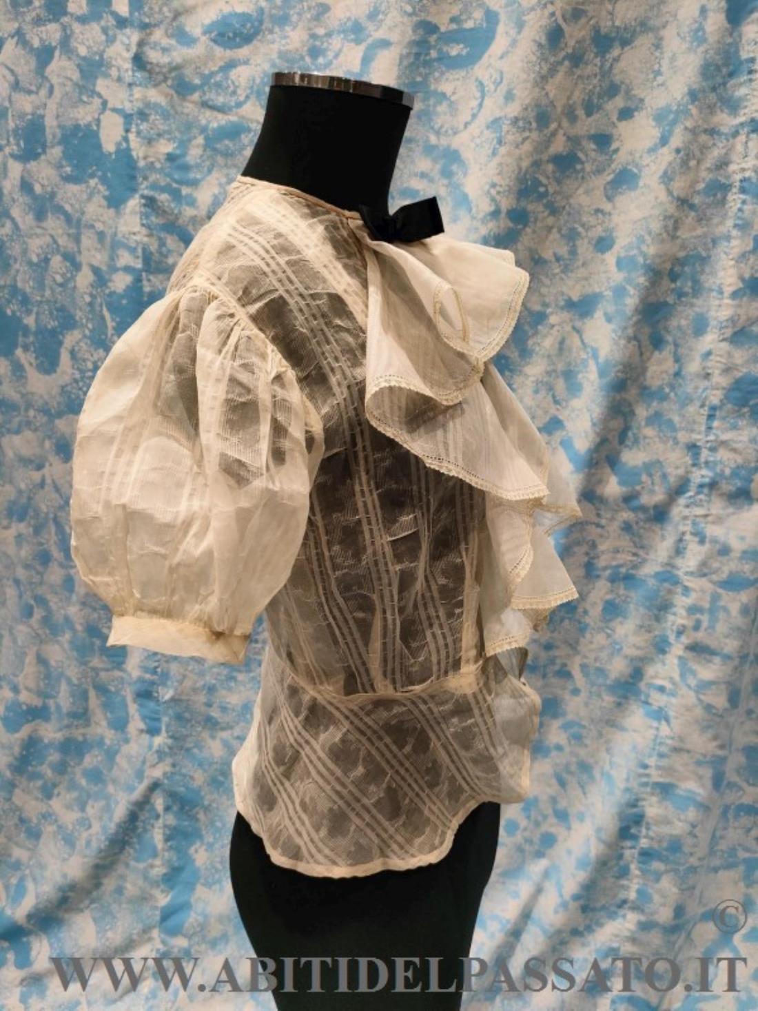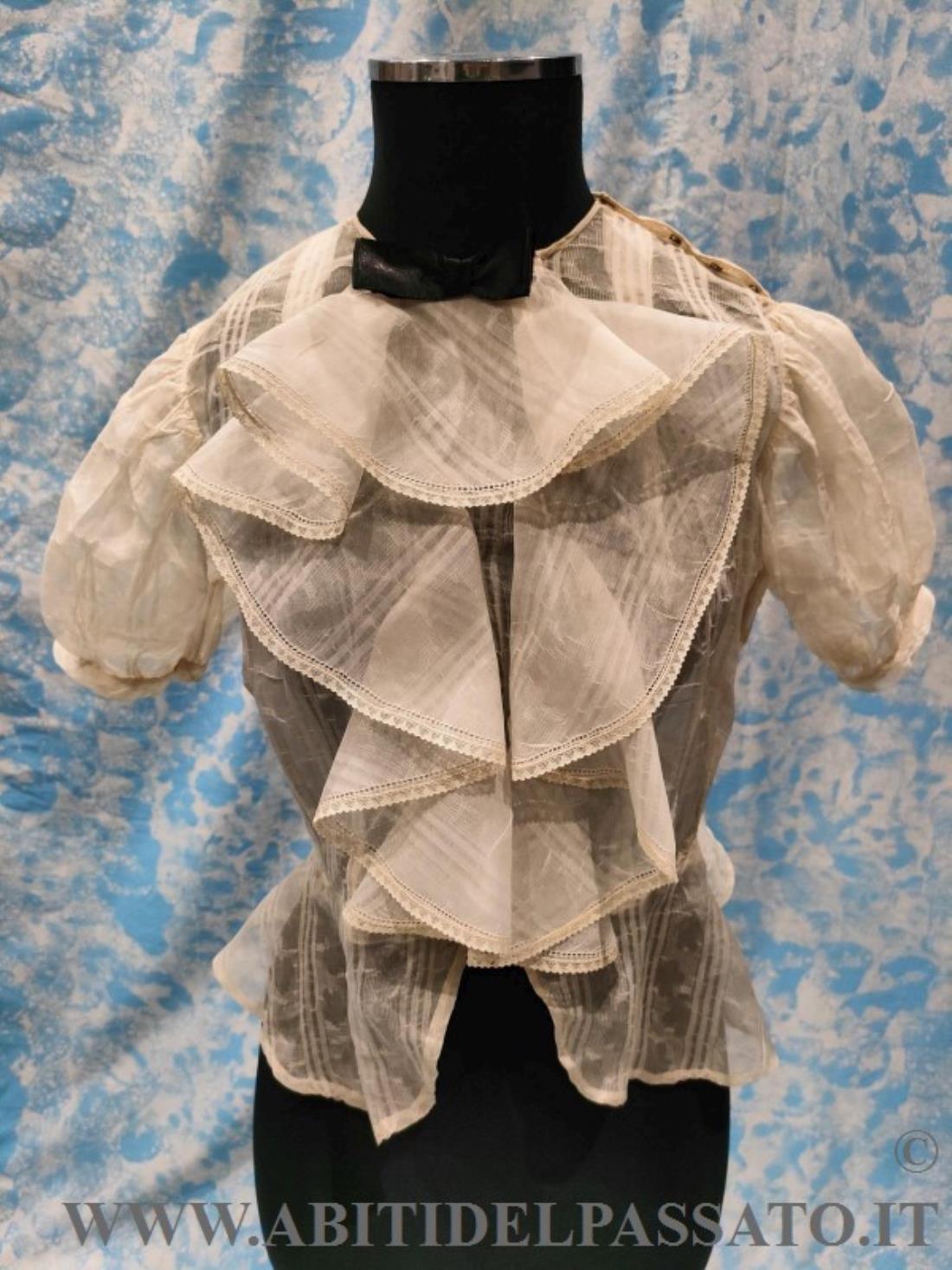 IL CAPO PRESENTA MANICHE CORTE A PALLONCINO ED E' TAGLIATA IN VITA CON BASCHINA SEMI SBIECA. APERTURA SU SPALLA E IN ENTRANBI I FIANCHI TRAMITE BOTTONI AUTOMATICI. DECORATA DA UNA GRANDE BALZA, APPLICATA NELLA PARTE FRONTALE E TERMINANTE CON PICCOLA PASSAMANERIA, E DA UN PAPILLON DI RASO NERO.