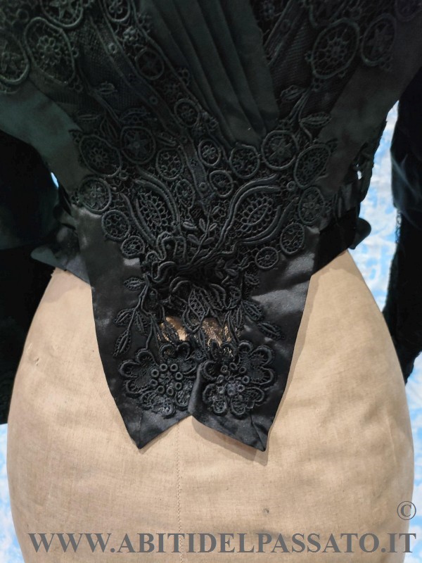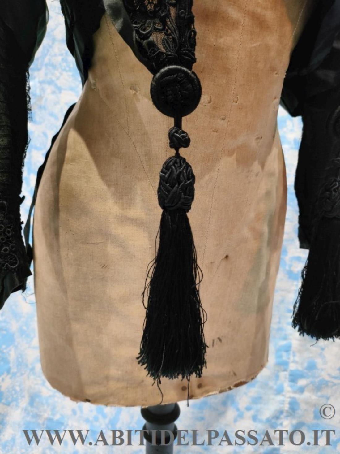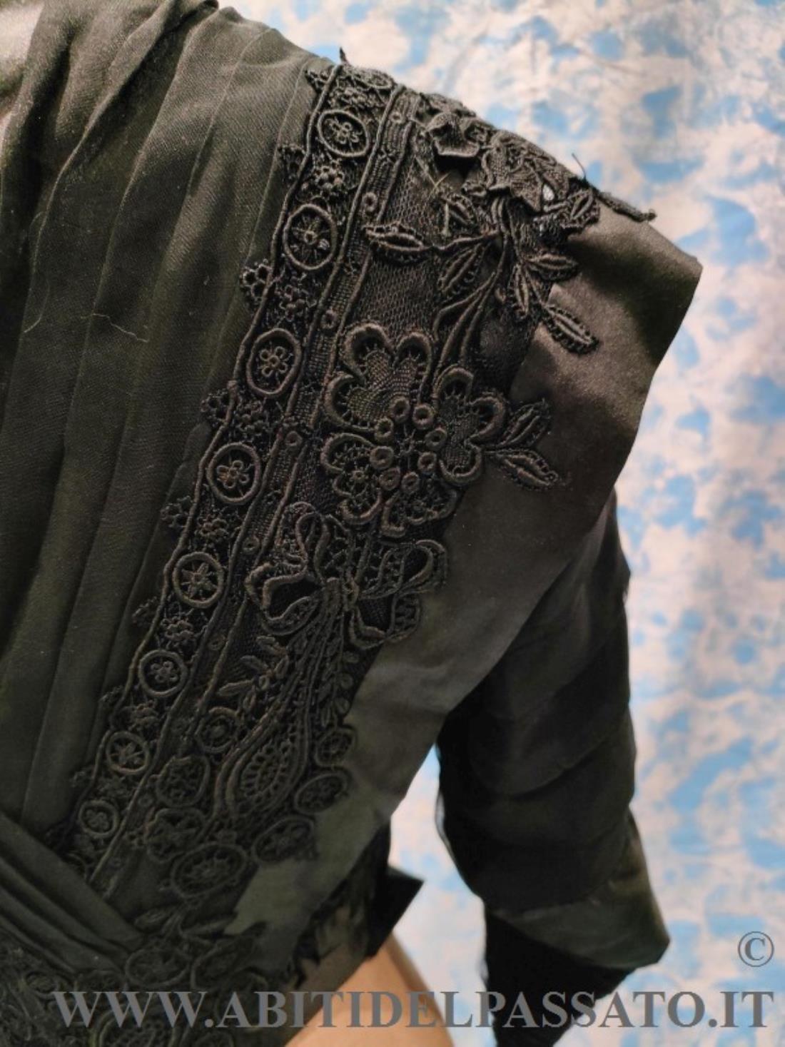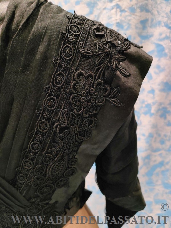 CORPINO DA GIORNO, REALIZZATO IN RASO DI SETA, CHIFFON DI SETA, MERLETTO MECCANICO, TULLE PLUMETIS, NAPPE, DI COLORE NERO.