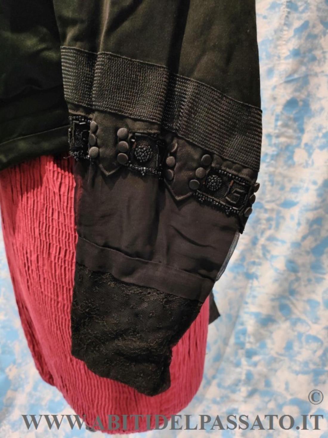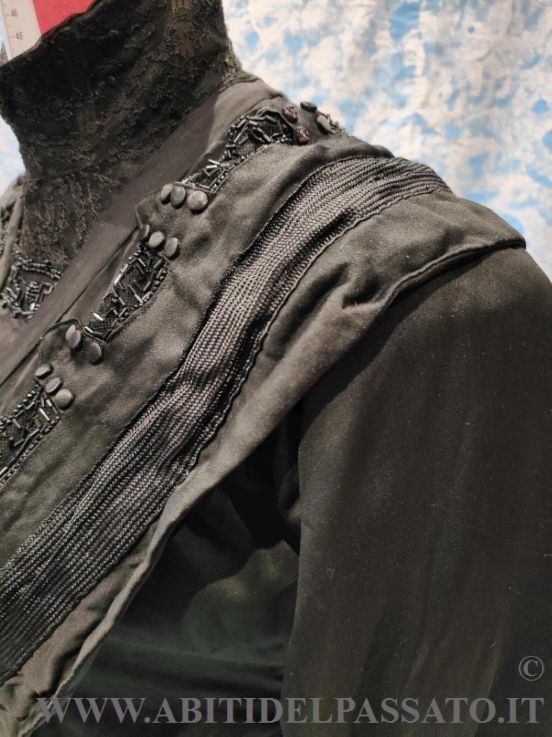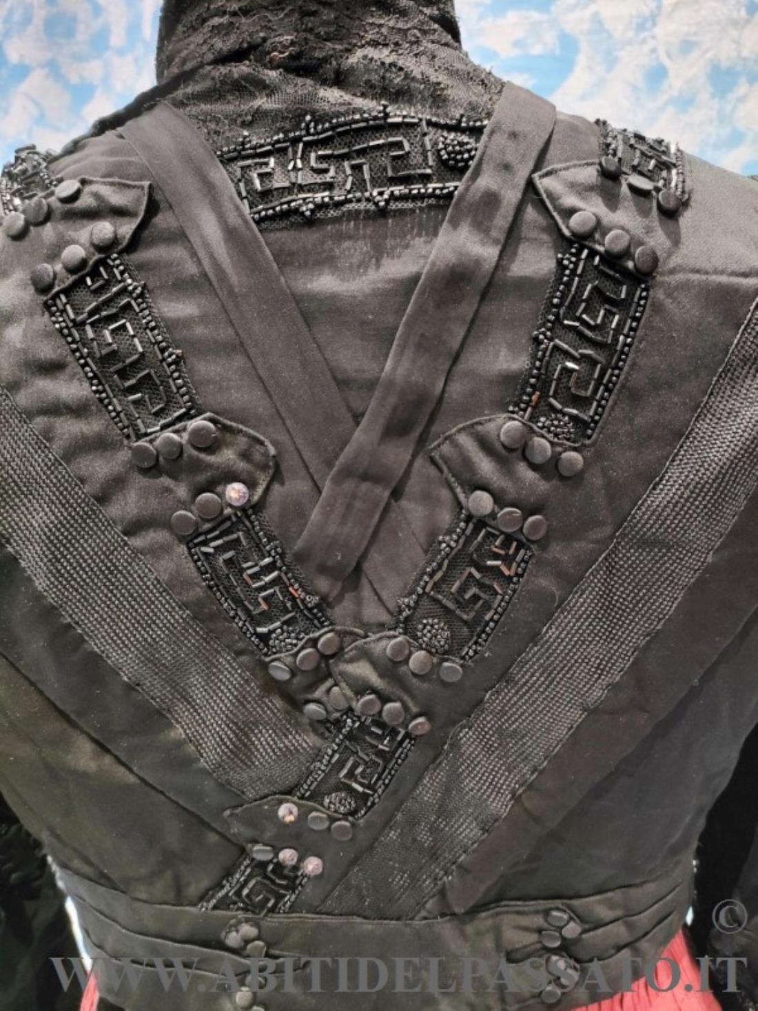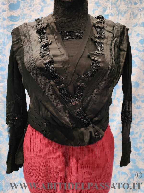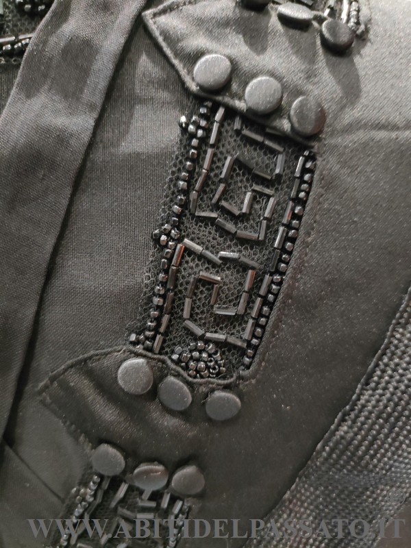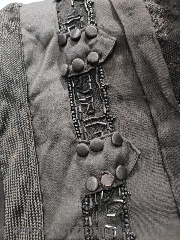 CORPINO DA GIORNO REALIZZATO IN RASO DI SETA NERO, DECORATO DA PASSAMANERIA, PERLINE E BOTTONI RICOPERTI IN TESSUTO.
