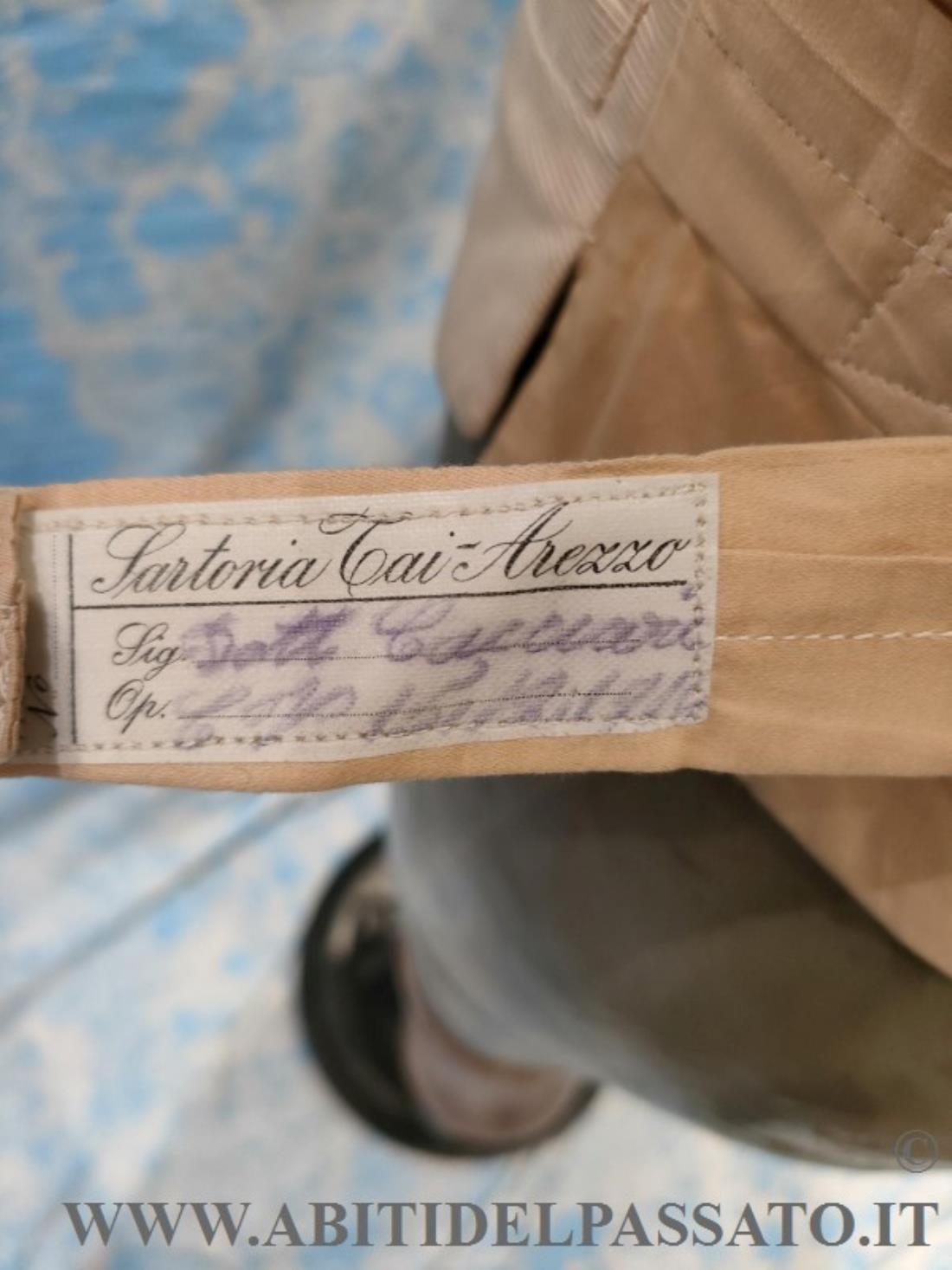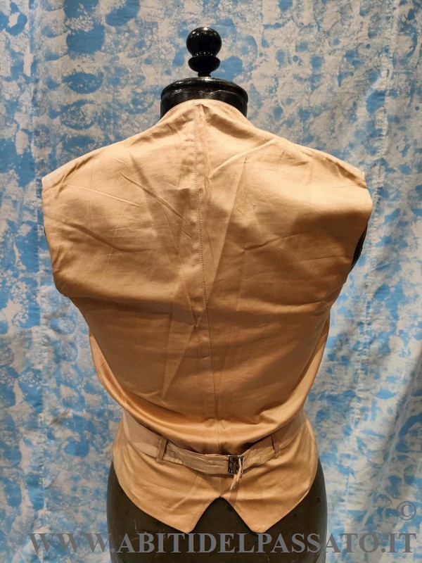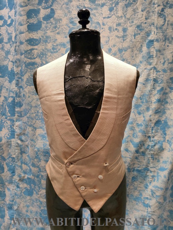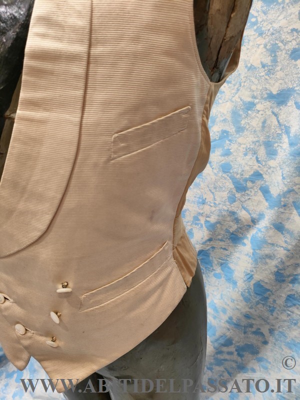 GILET MASCHILE, REALIZZATO PER IL MATRIMONIO DEL DOTT. CACCIARI, IL 14 DICEMBRE DEL 1912 O 14 (l'anno non si legge bene).REALIZZATO IN OTTOMAN DI SETA COLOR AVORIO, ABBOTTONATURA A DOPPIO PETTO, CHIUSO DA BOTTONI IN MADRE PERLA, FODERA IN COTONE.