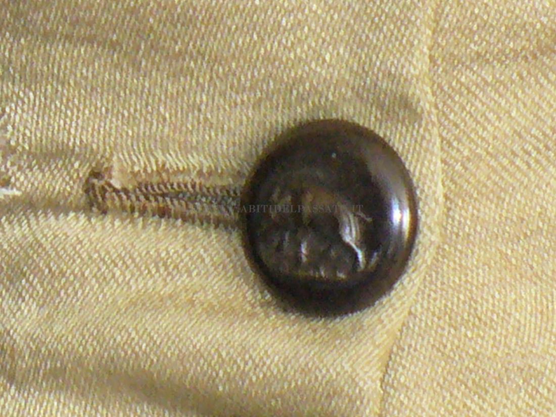 1880: CORPINO REALIZZATO IN RASO DI SETA COLOR MARRON GLACE E BROCCATO DI SETA A DISEGNO FLOREALE, GUARNITO DA NASTRI E CHIFFON. PARTICOLARI I BOTTONI, CHE ALTERNATI FIGURANO ANIMALI DA CACCIA COME IL CINGHIALE E IL CERVO.