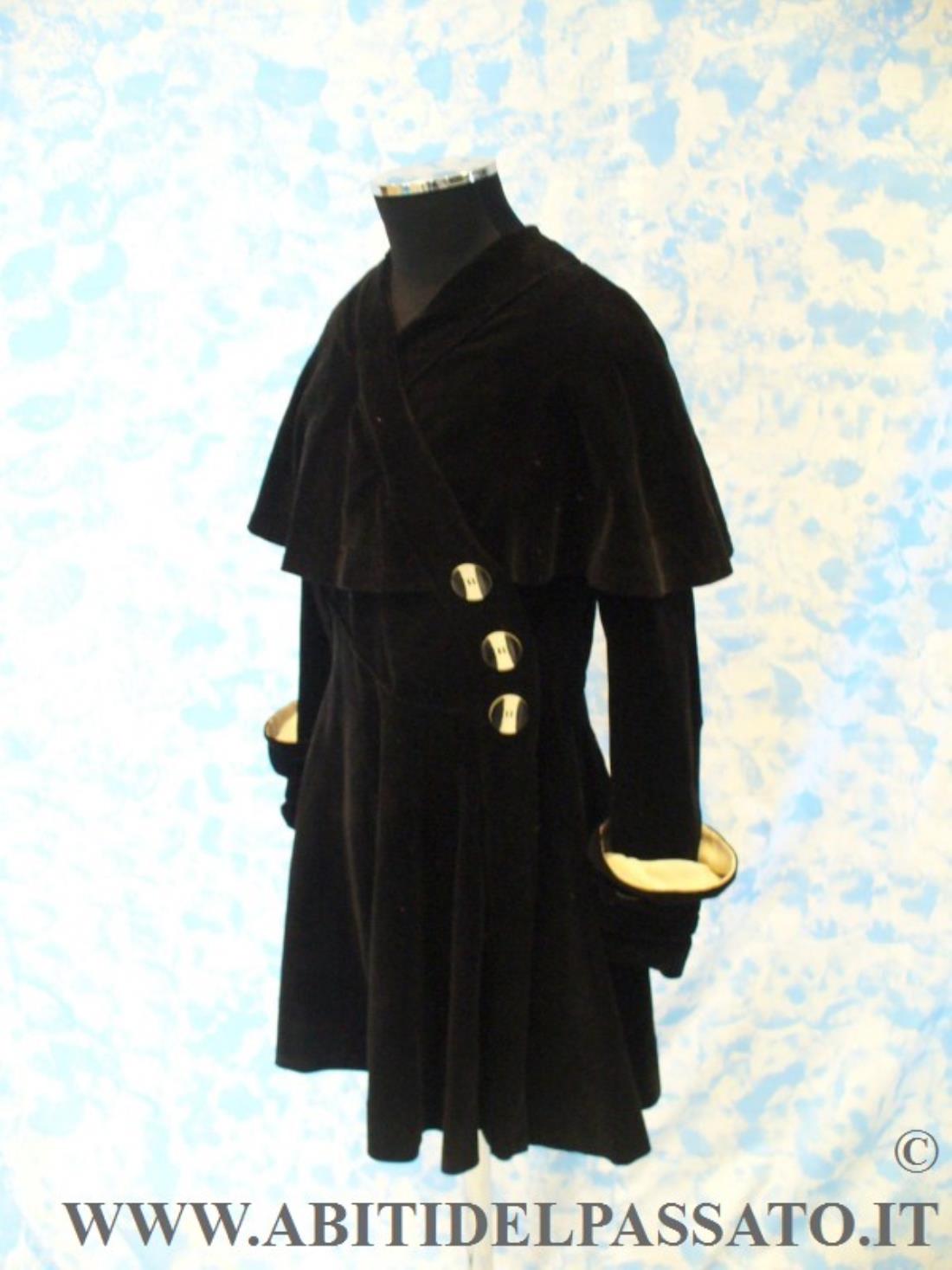 1930 CIRCA, ITALIA MERIDIONALE, GIACCA REALIZZATA IN VELLUTO NERO CON RIMESSI SU POLSI DOPPIATI A CONTRASTO DI COLORE BIANCO. COLLO A SCIALLE INCROCIATO, PROLUNGATO DA MANTELLINA, MOTIVO TIPICO DEL PERIODO. FINTA SCOLLATURA FERMATA DA 3 GRANDI BOTTONI. IL CAPO NON HA APERTURE, SI INFILA COME UNA MAGLIA.