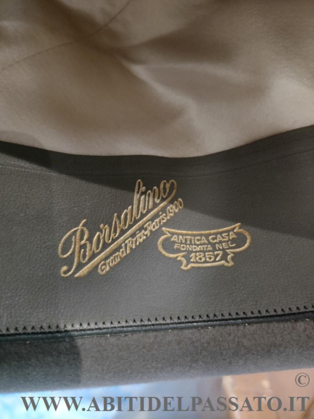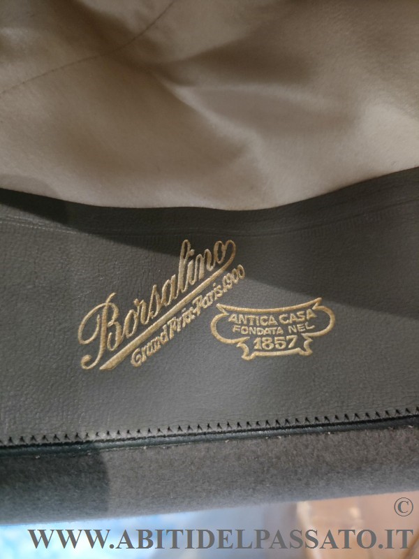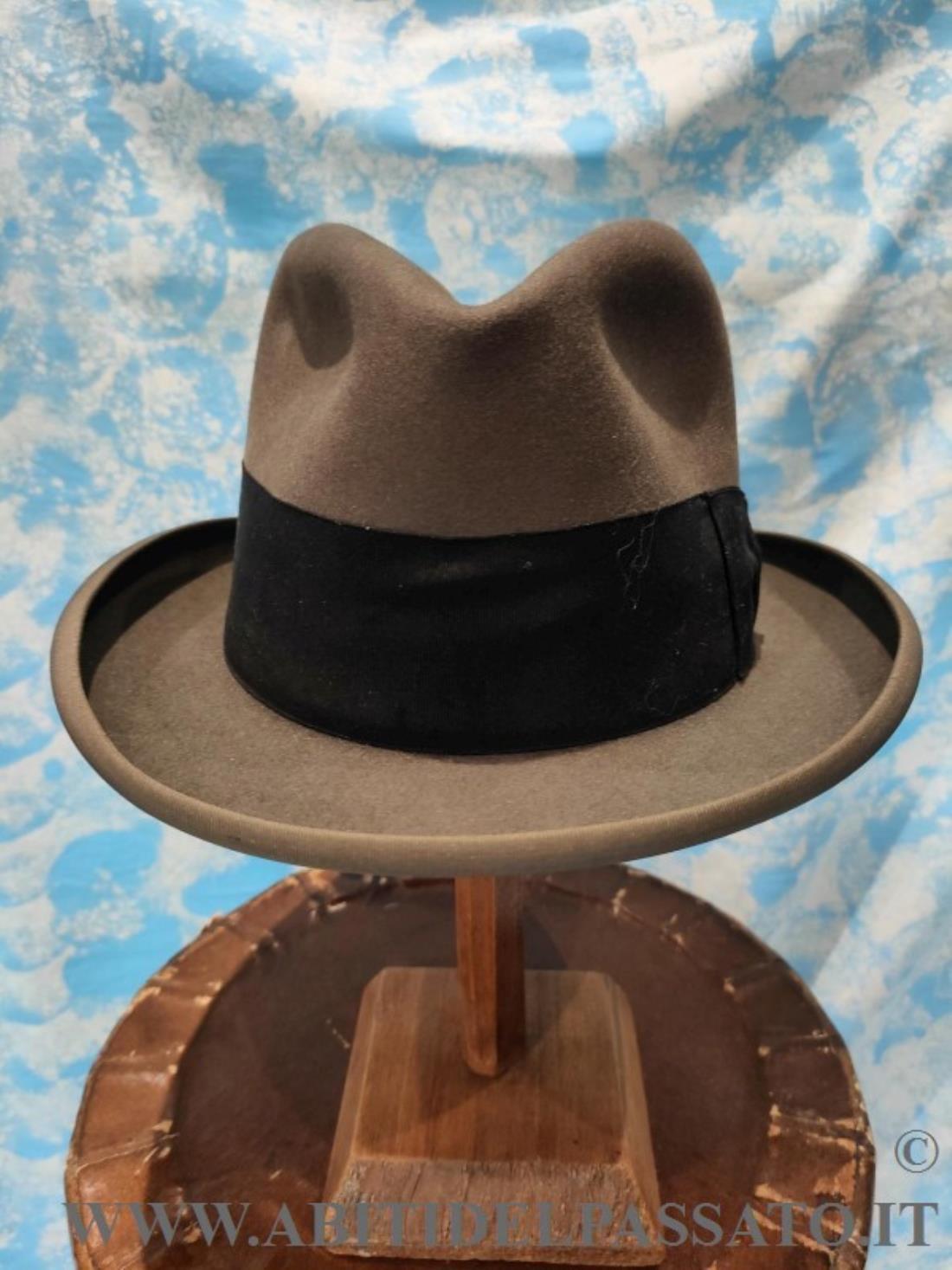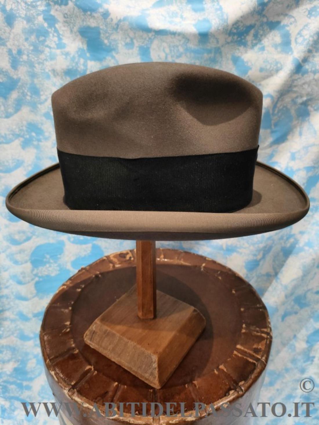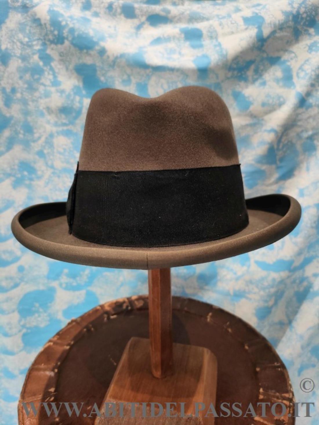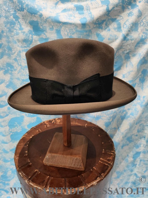 LOBBIA MASCHILE, REALIZZATA IN PANNO COLOR TORTORA, DECORATA DA ALTO NASTRO DI SETA NERO, FODERA IN RASO DI SETA COLOR BURRO. IL CAPPELLO NON E' MAI STATO INDOSSATO