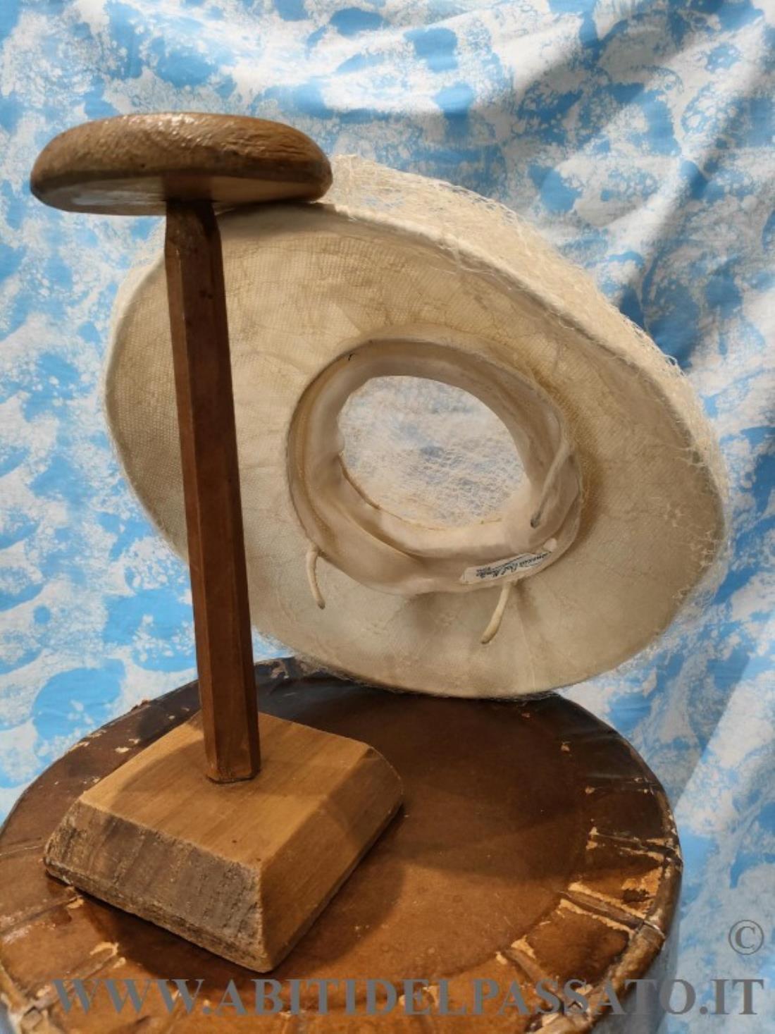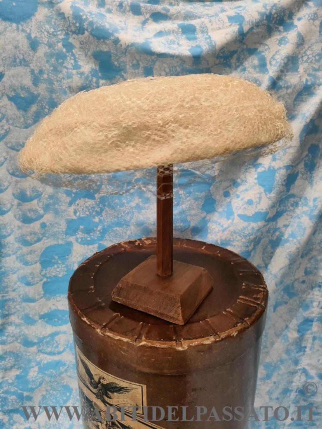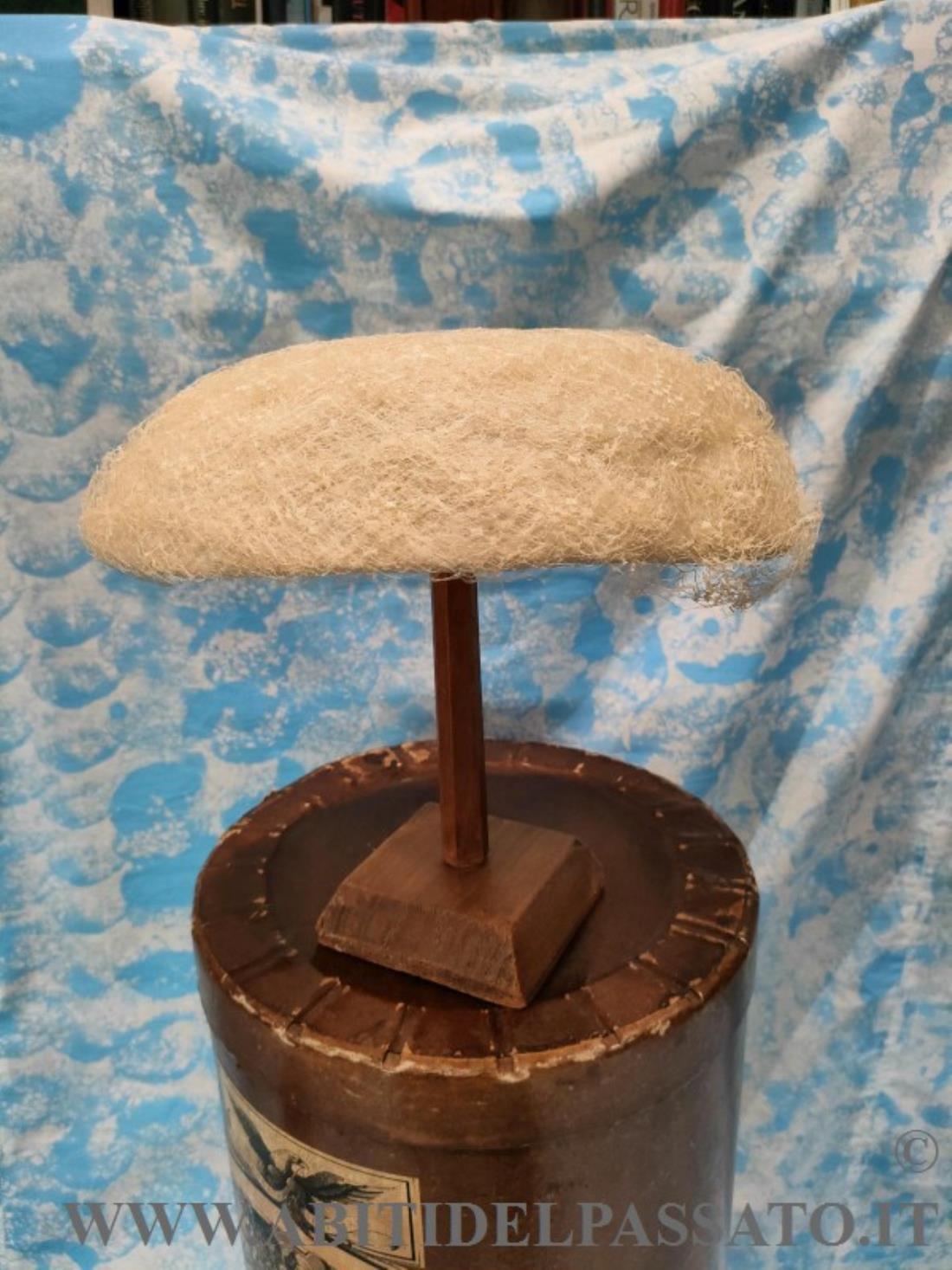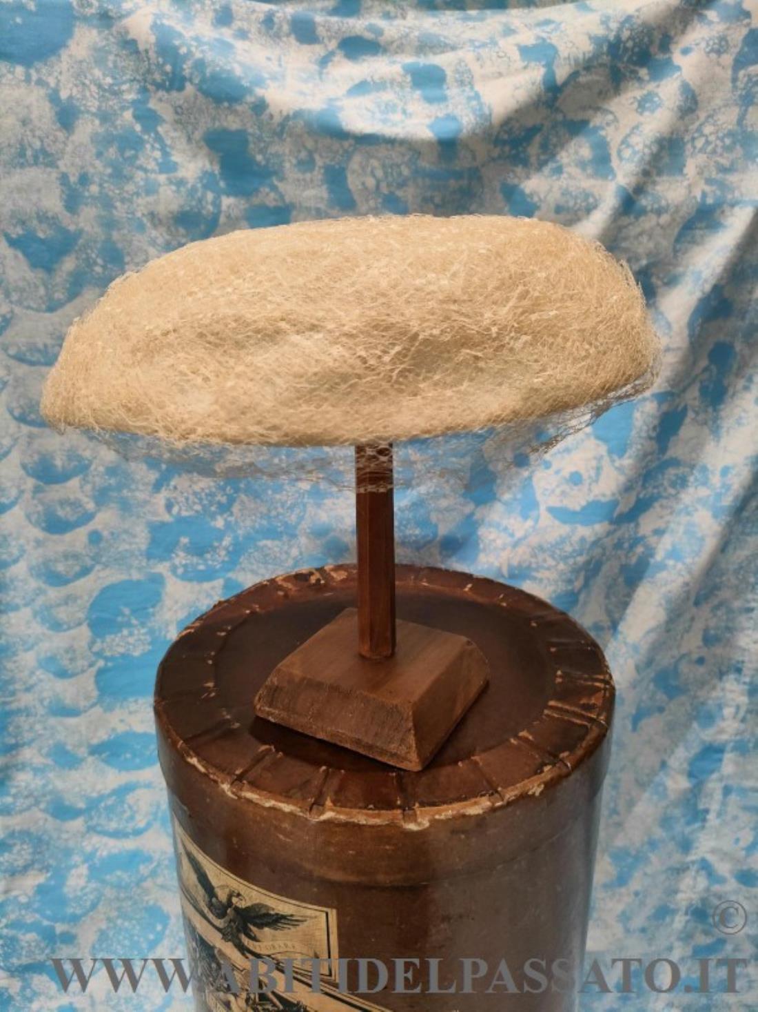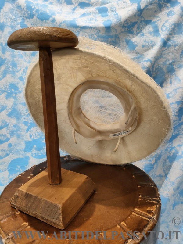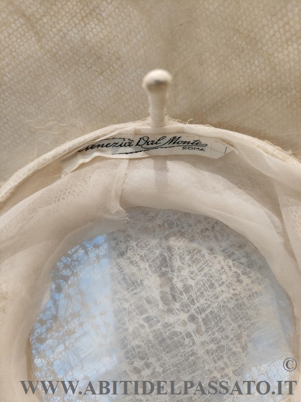 1950-55, MANIFATTURA ITALIANA, ETICHETTA: SEMEZIA DAL MONTE, ROMA. CAPPELLO A PAGODA, COSTRUITO SU UNA STRUTTURA METALLICA, RIVESTITO IN TULLE, PLUMETIS E ORGANZA DI SETA DI COLORE AVORIO. CONDIZIONI ECCELLENTI.
