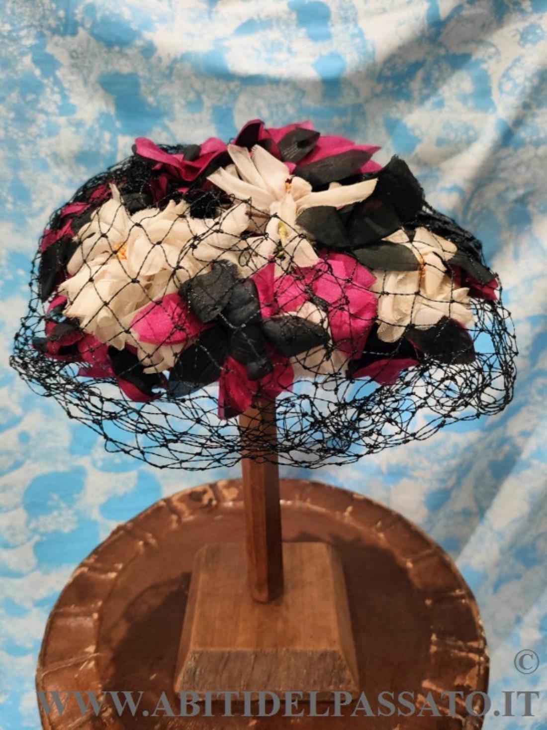 ELEGANTE CAPPELLO REALIZZATO DA TELAIO METALLICO, RICOPERTO DA GRANDI FIORI IN SETA, FIOCCO POSTERIORE IN RAFFIA INTECCIATA E ARRICCHITO DA VELETTA IN TULLE.