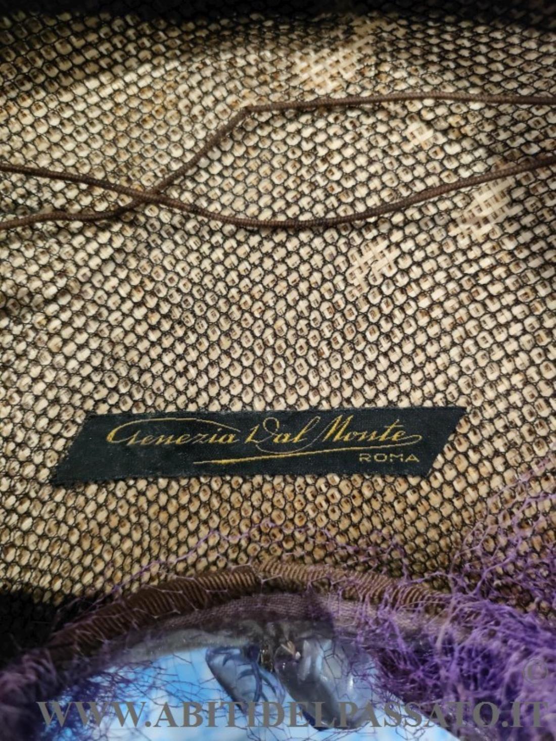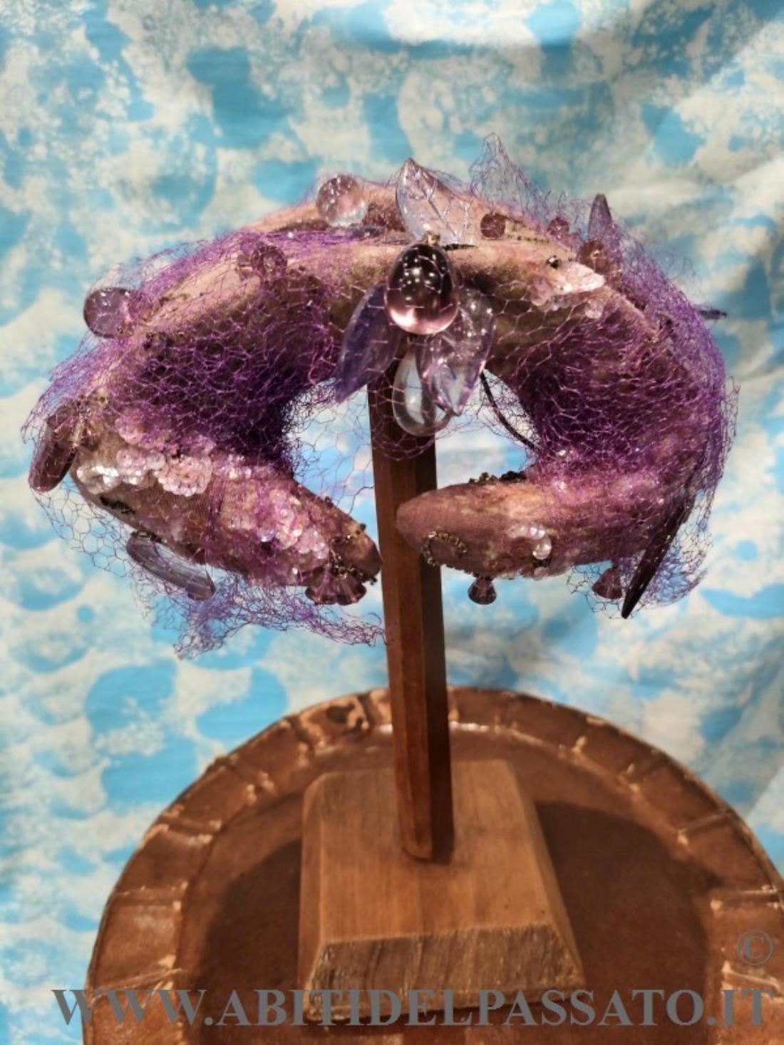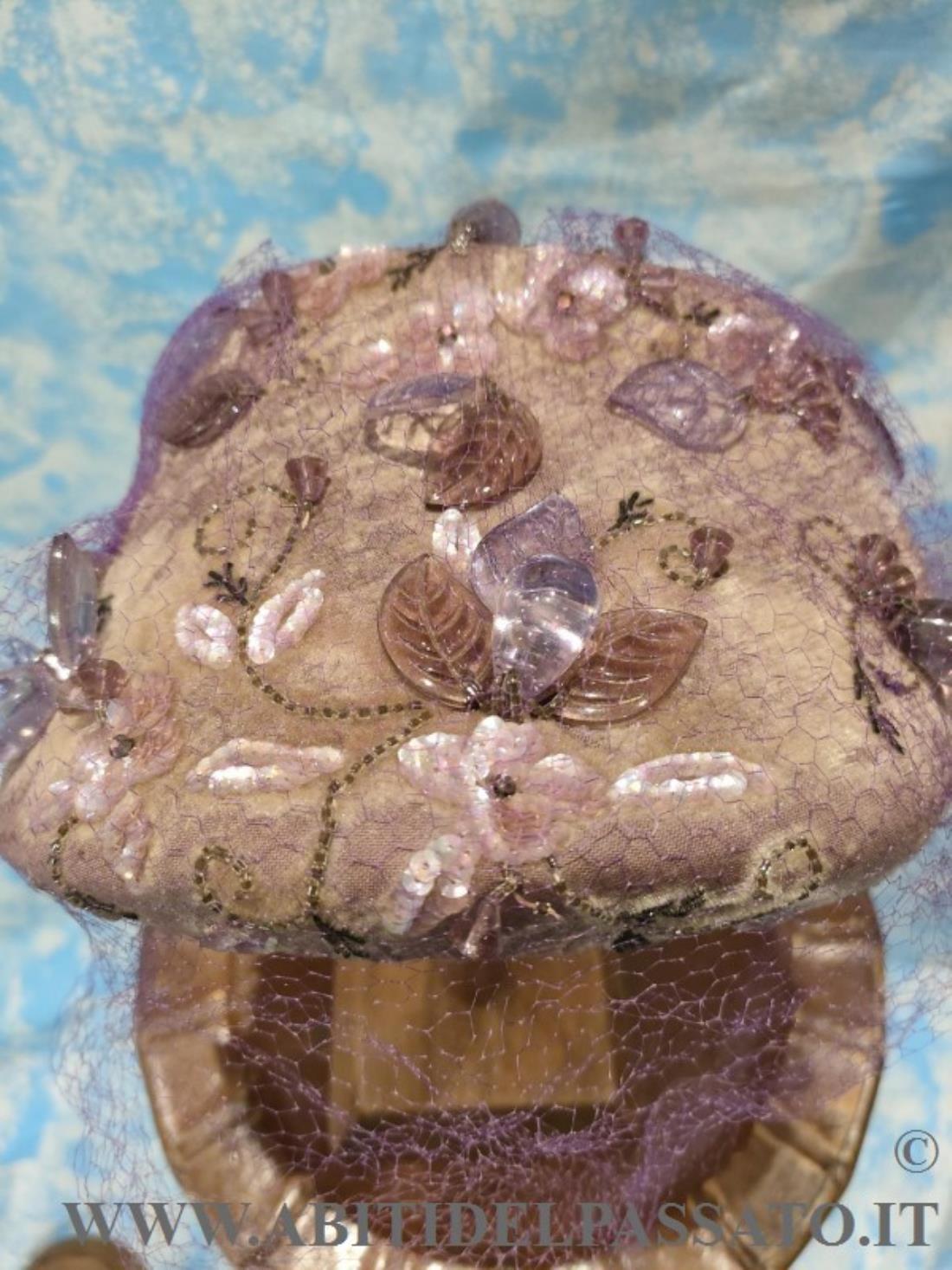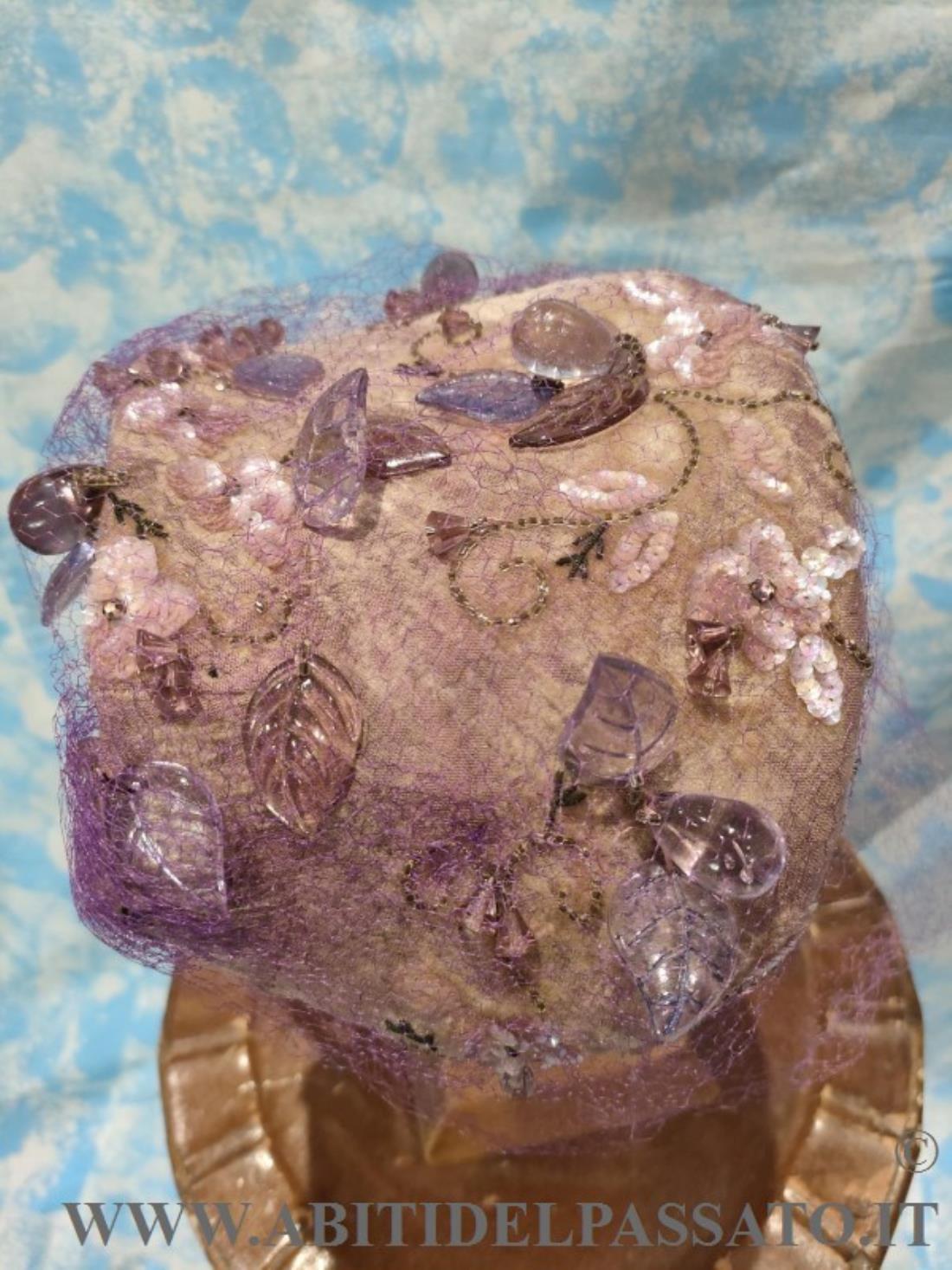 RAFFINATO CAPPELLINO, REALIZZATO DA STRUTTURA METALLICA, RIVESTITA DA TESSUTO IN SETA STAMPATA NEI TONI DEL LILLA E RICCAMENTE RICAMATO DA GRANDI GOCCE E FOGLIE IN VETRO, PAILLETTES, CONTERIE, CANUTIGLIA, PIETRE CASTONE ED ALTRI ELEMENTI VITREI, RIVESTITO IL TUTTO DA VELETTA IN TULLE DI SETA IN TONO.