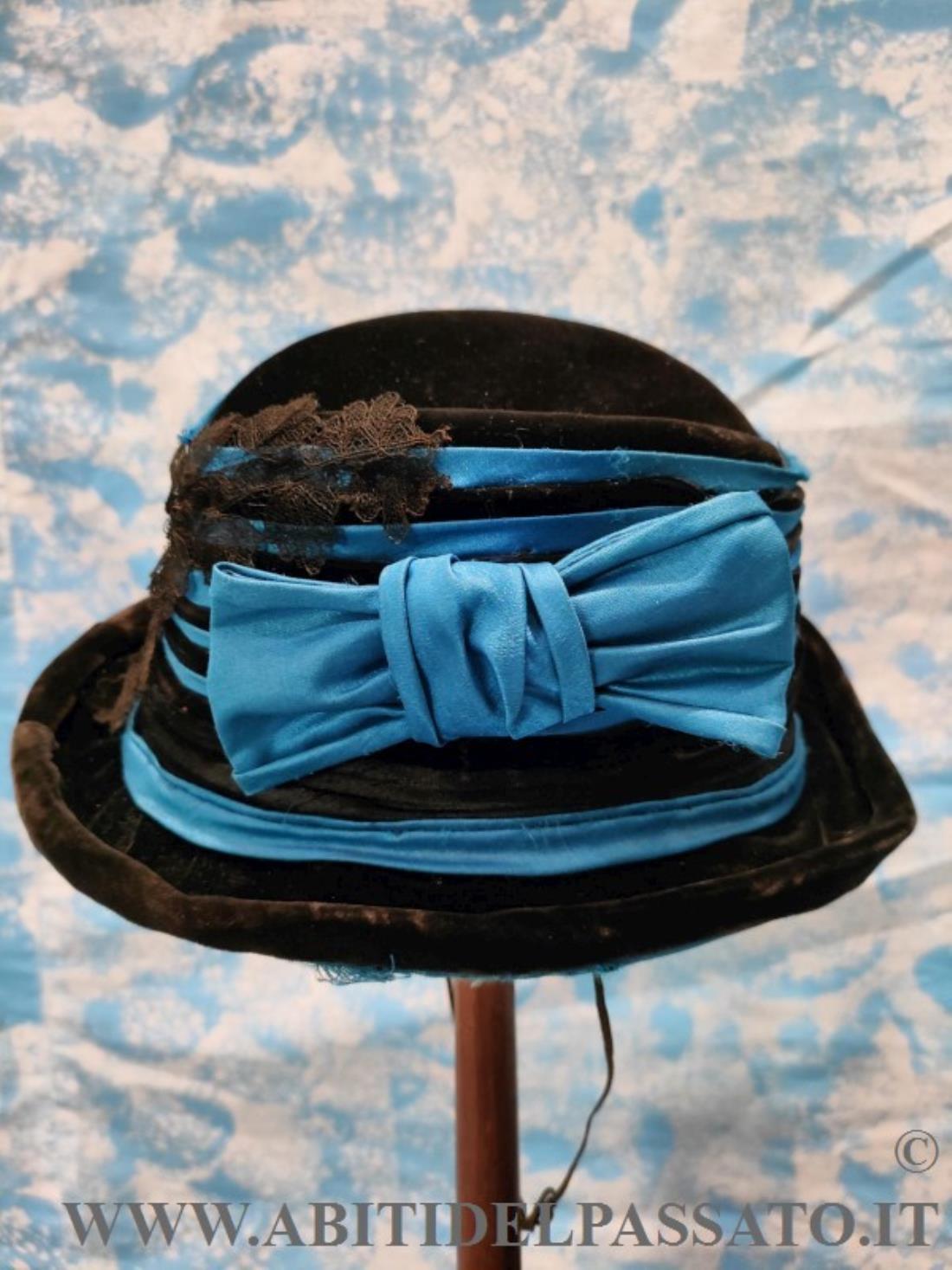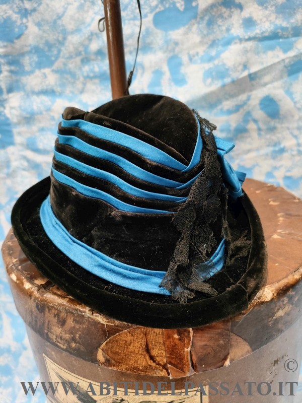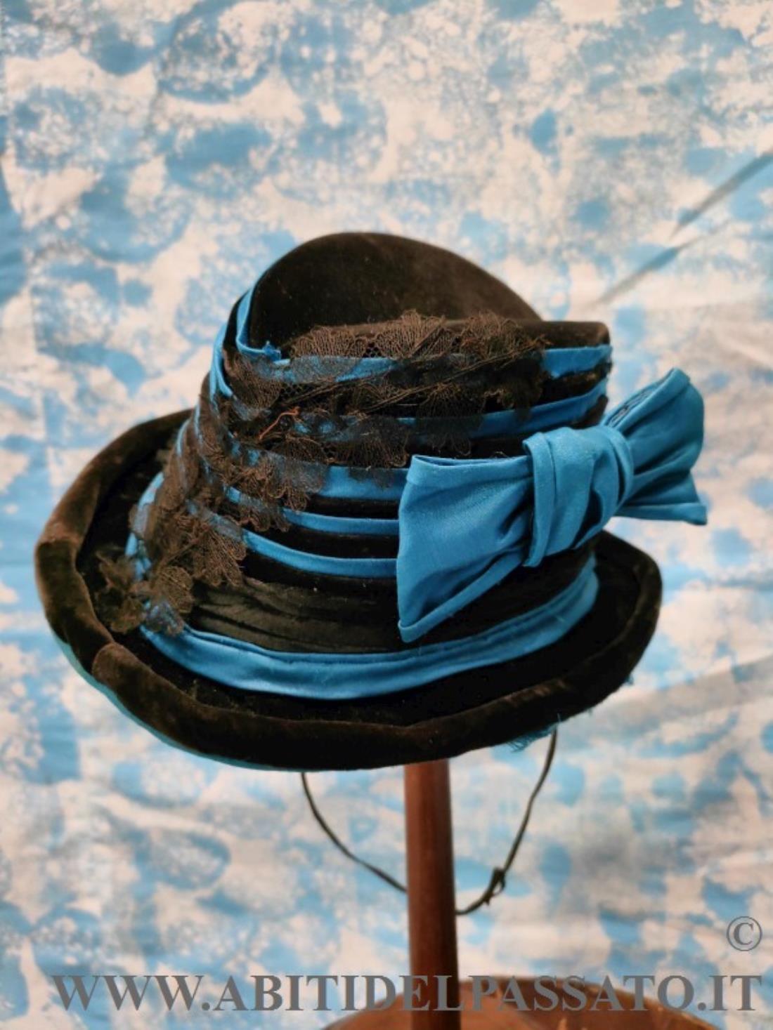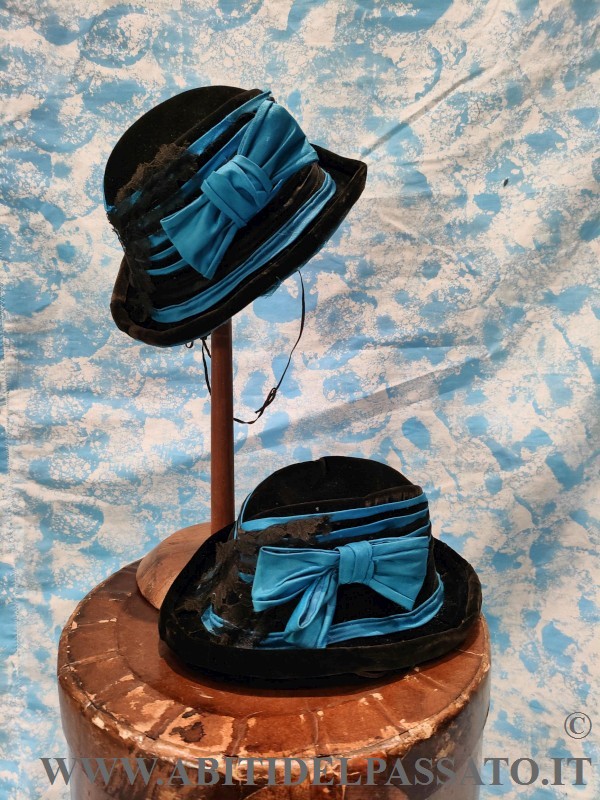 STRAORDINARIA COPPIA DI CAPPELLI UGUALI (probabilmente mamma e figlia o due sorelle), REALIZZATI IN VELLUTO DI SETA NERO, RASO DI SETA BLUE ELETTRICO E MERLETTO MECCANICO NERO.