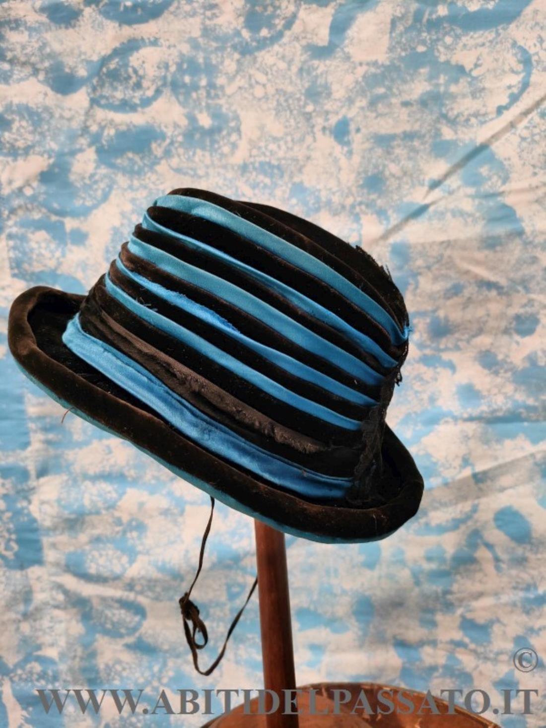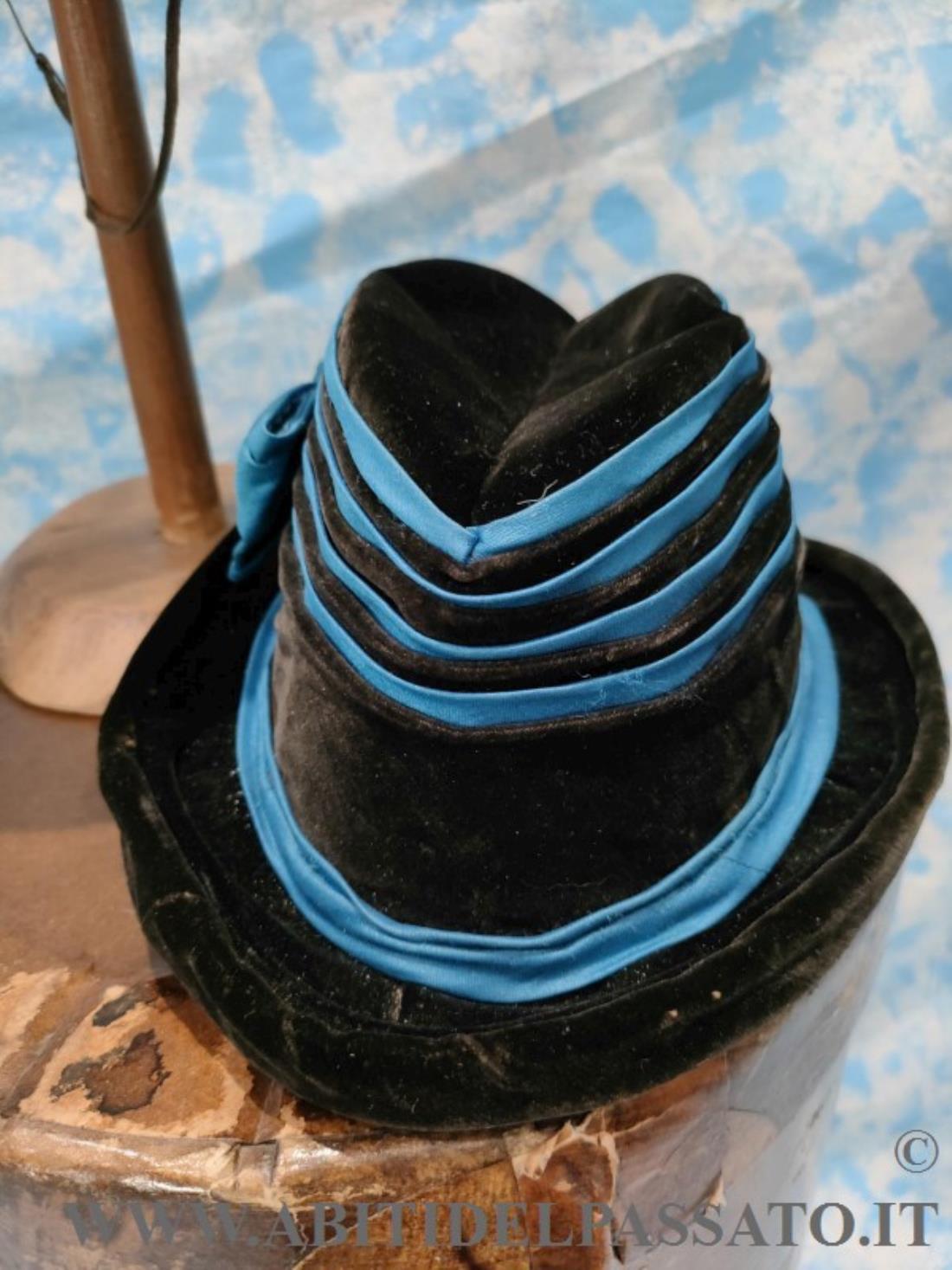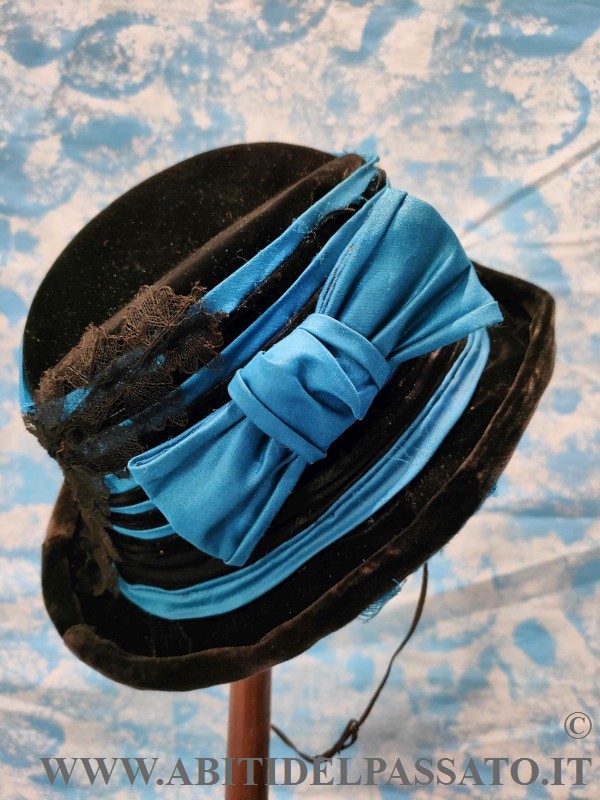 STRAORDINARIA COPPIA DI CAPPELLI UGUALI (probabilmente mamma e figlia o due sorelle), REALIZZATI IN VELLUTO DI SETA NERO, RASO DI SETA BLUE ELETTRICO E MERLETTO MECCANICO NERO.