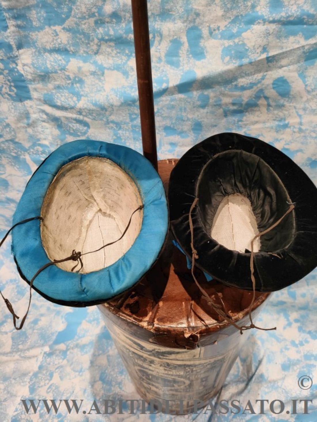 I CAPPELLI ESTERNAMENTE SI PRESENTANO UGUALI, L'UNICA DIFFERENZA, SI PRESENTA INTERNAMENTE, IN QUANTO LA PICCOLA TESA, IN UNO E' STATA RIVESTITA DI VELLUTO NERO E NELL'ALTRO IN RASO BLUE ELETTICO.