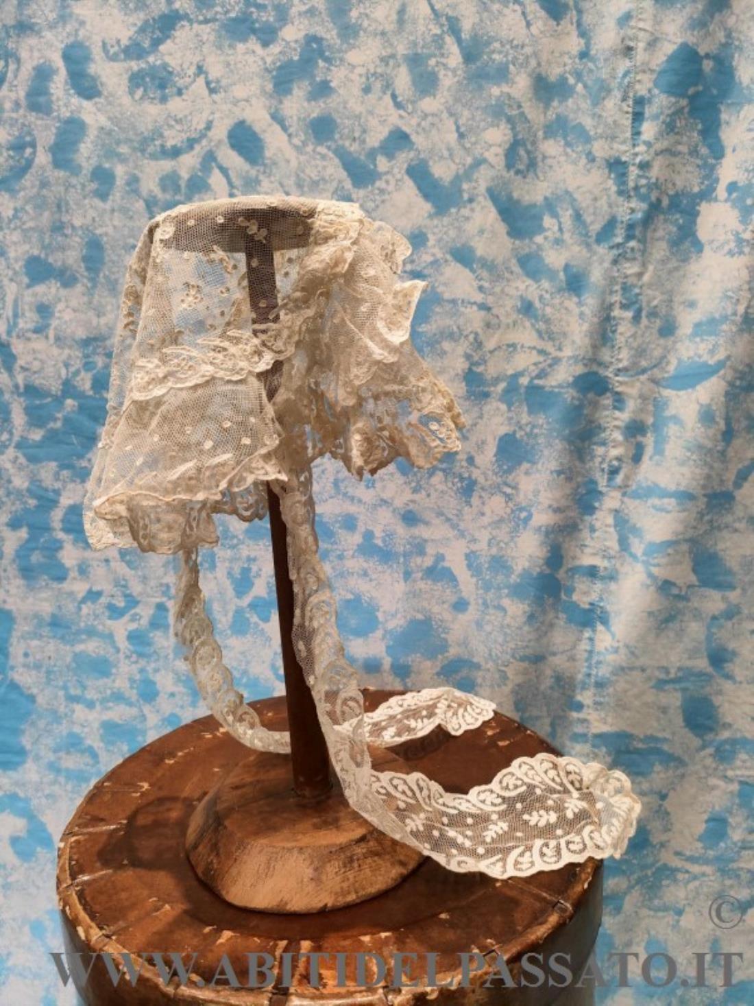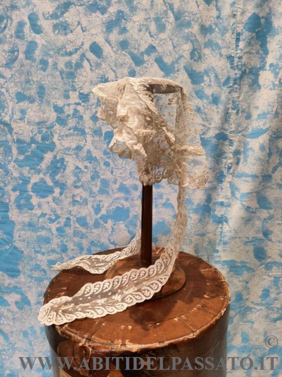 1870-1880 CIRCA, MANIFATTURA ITALIANA, PROVENIENZA CITTA' DI BERGAMO, PER QUESTA CUFFIA DA CASA, REALIZZATA IN MERLETTO MECCANICO DI COLORE BIANCO. UN ELASTICO PER BLOCCARLA ALLO CHIGNON E' POSTO NELLA PARTE POSTERIORE.