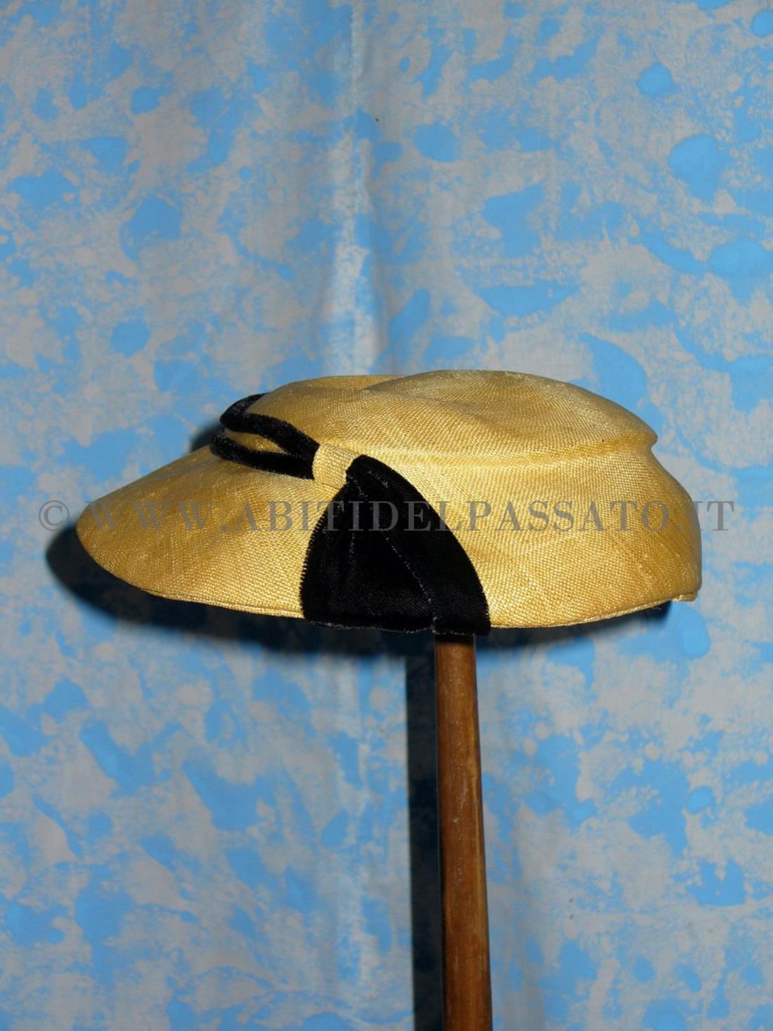 1952: CAPPELLO REALIZZATO IN PAGLIA DI COLOR NATURALE E DECORATO DA NASTRINO DI VELLUTO NERO.