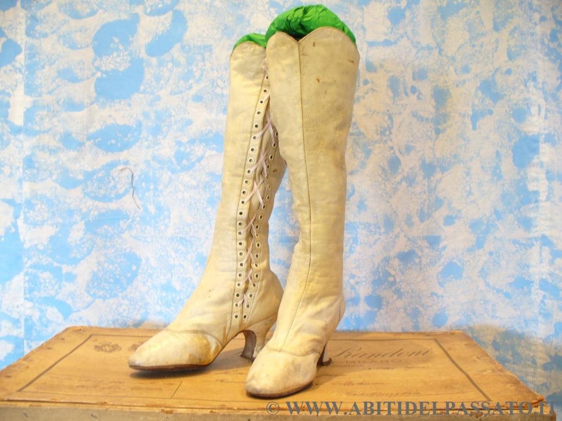 1890: ALTISSIMI STIVALI FEMMINILI REALIZZATI IN FINISSIMA PELLE DI CAPRETTO. CHIUSURA LATERALE MEDIANTE LACCI (mancanti), CONDIZIONI BUONE.