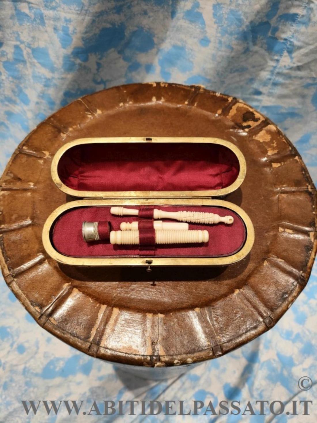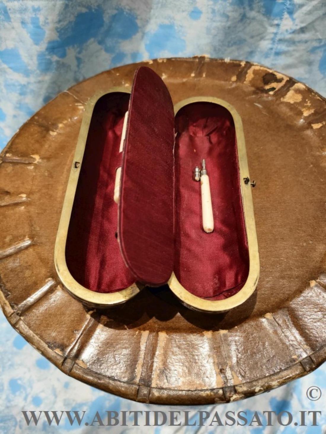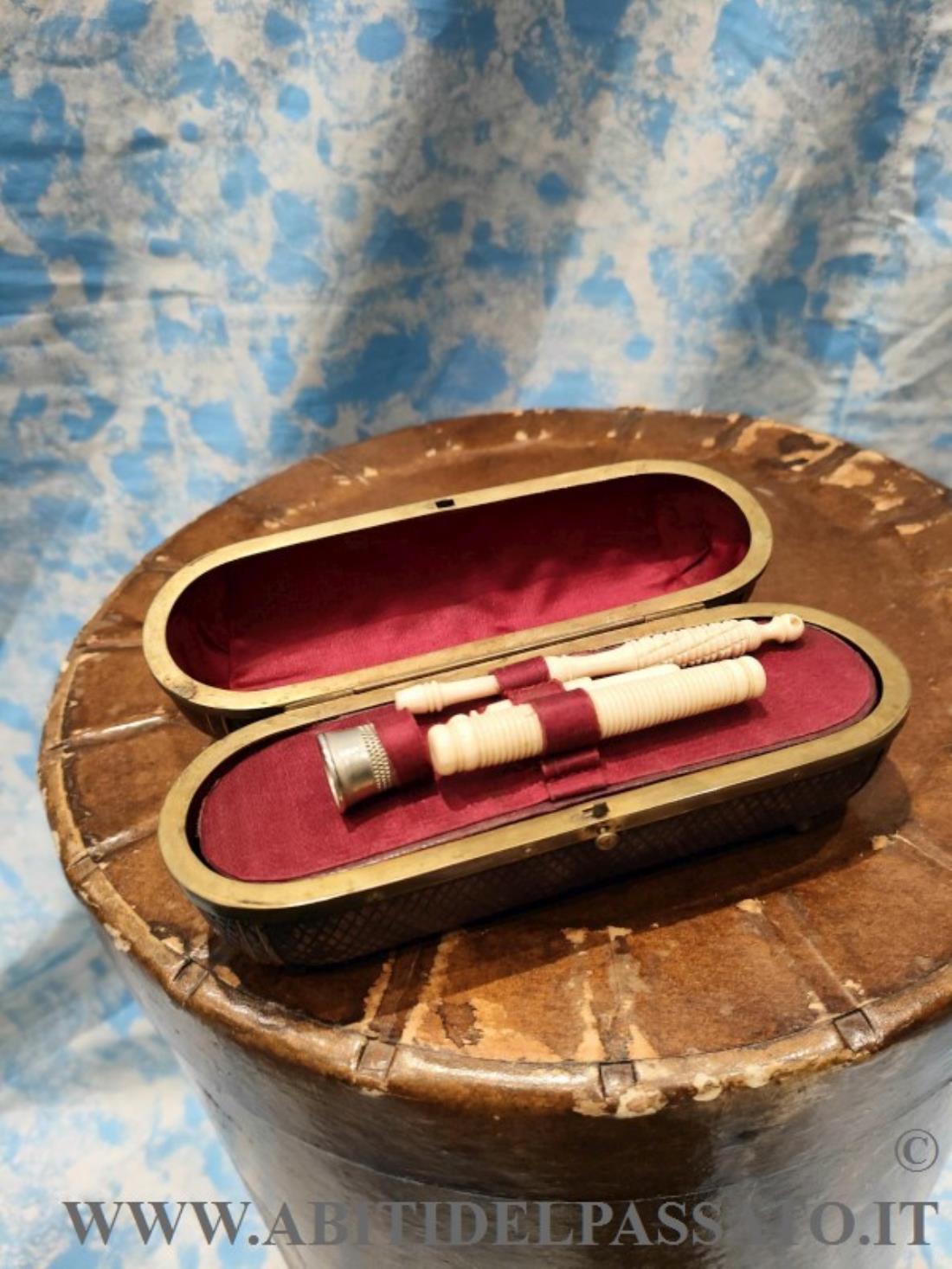 1870-1880, MANIFATTURA ITALIANA, BORSETTA DA VIAGGIO, CONTENENTE KIT DA LAVORO AD AGO, ED ESATTAMENTE, DITALE IN METALLO ARGENTATO, PORTA AGHI, PORTA SPILLI E BASE PER UNCINETTO, REALIZZATI IN AVORIO. COFANETTO ESTERNO REALIZZATO IN PELLE MARTELLATA. LA BORSETTA E' DI VISA IN DUE SCOMPARTI E FODERATA INTERNAMENTE DI RASO DI SETA ROSSO.