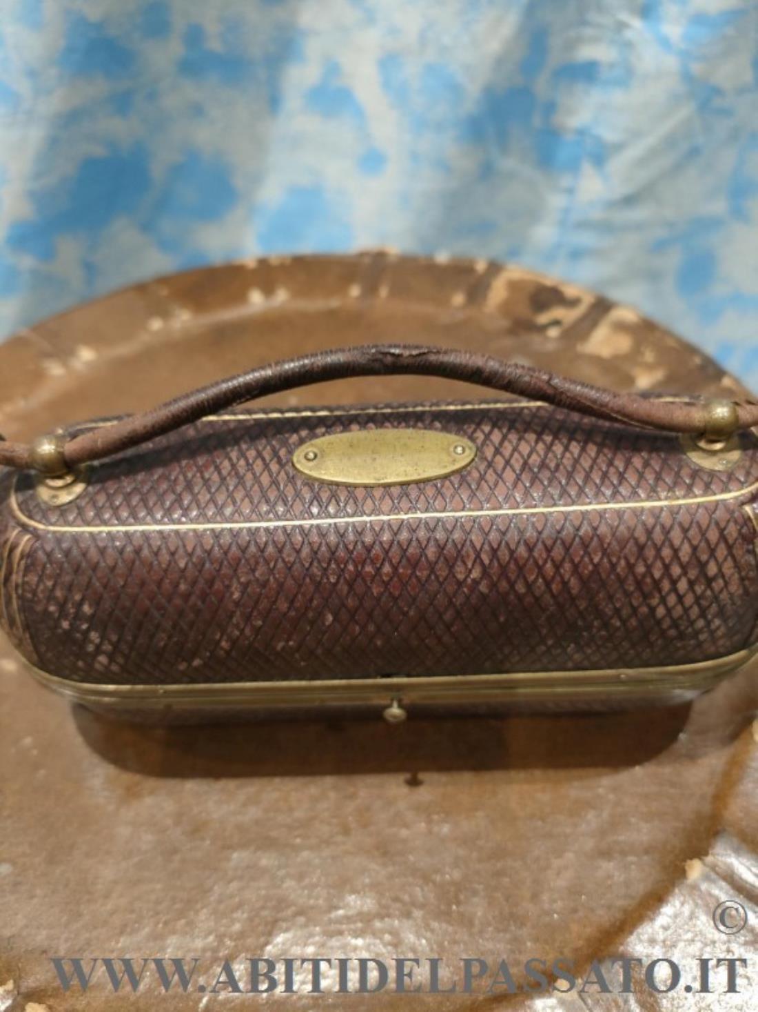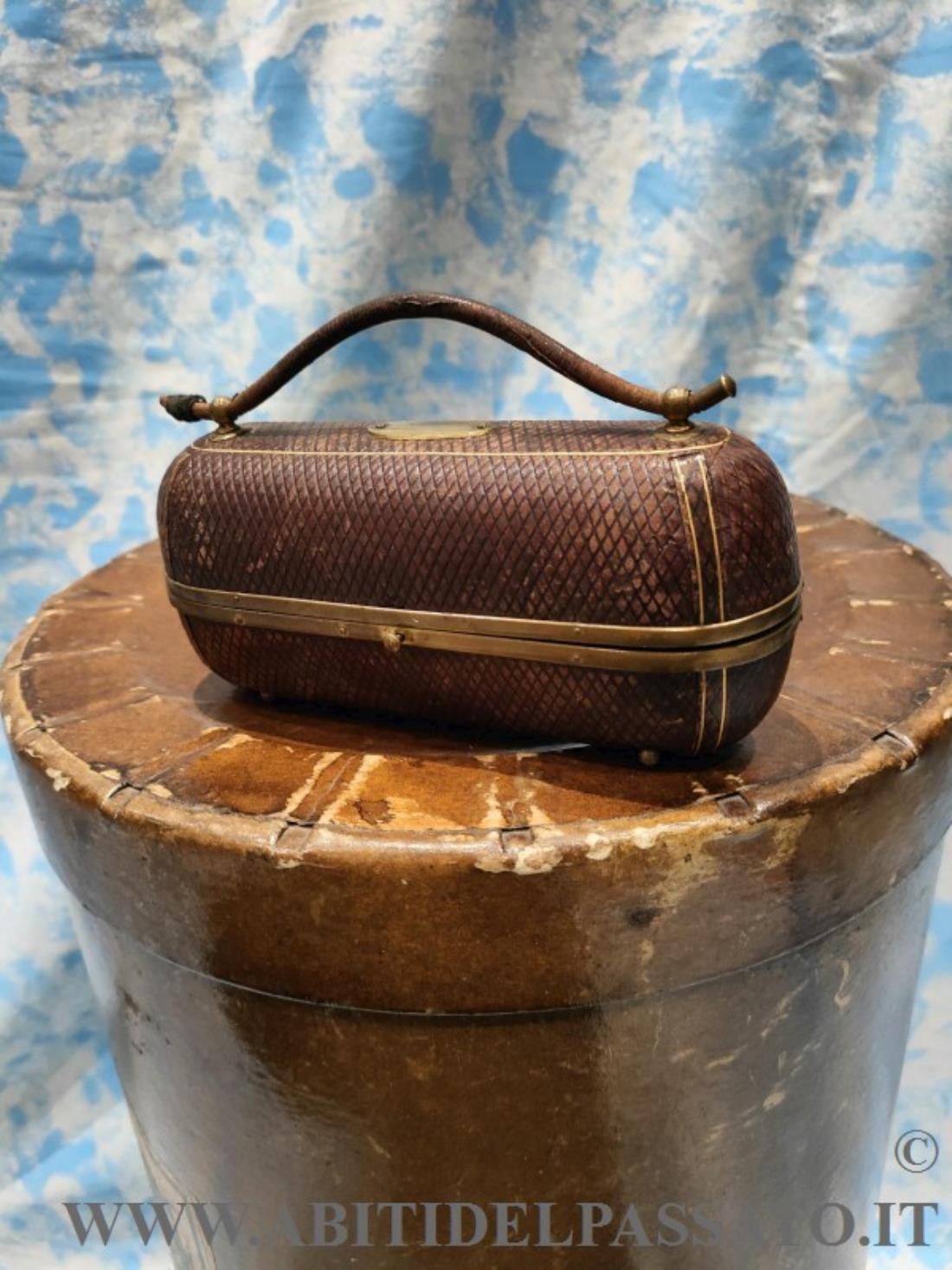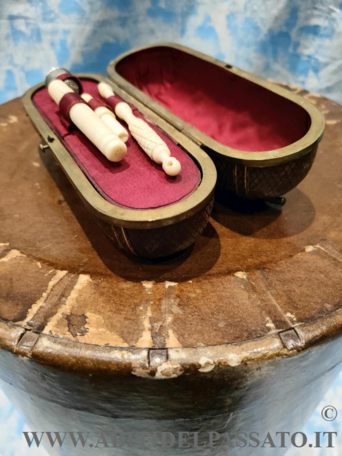 1870-1880, MANIFATTURA ITALIANA, BORSETTA DA VIAGGIO, CONTENENTE KIT DA LAVORO AD AGO, ED ESATTAMENTE, DITALE IN METALLO ARGENTATO, PORTA AGHI, PORTA SPILLI E BASE PER UNCINETTO, REALIZZATI IN AVORIO. COFANETTO ESTERNO REALIZZATO IN PELLE MARTELLATA. LA BORSETTA E' DI VISA IN DUE SCOMPARTI E FODERATA INTERNAMENTE DI RASO DI SETA ROSSO.