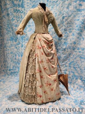 ABITO DA PASSEGGIO COMPOSTO DA CORPINO E GONNA E REALIZZATO CANNELLATO DI SETA COLOR GRIGIO CHIARO, SETA STAMPATA A MOTIVI FLOREALI CON FONDO IN TONO ALL'ABITO, PIZZO, RASO DI ...