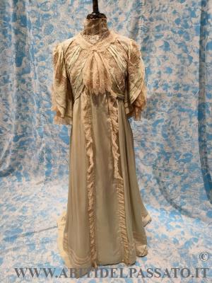 1905-7, ABITO INTERO REALIZZATO IN TESSUTO MISTO SETA DI COLORE AZZURRO E PIZZO CHIMICO. MANIFATTURA IGNOTA, MA PROVIENE SEMPRE DAL GUARDAROBA DI NAPOLI.
