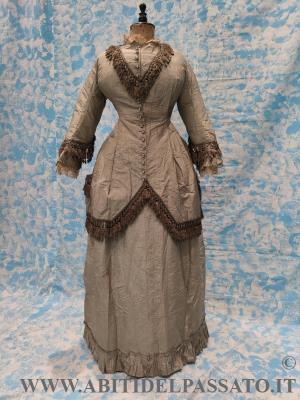1872: ABITO DA GIORNO REALIZZATO IN TAFFETAS DI SETA PESANTE, COMPOSTO DA GIACCA LUNGA E GONNA. CORPINO CON APERTURA FRONTALE MEDIANTE GANCI FINO A 10 CENTIMETRI SOTTO IL PUNTO VITA. NEL LATO DESTRO SI NOTI LA PICCOLA PER IL VENTAGLIO.