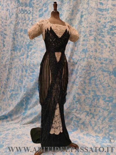 1900: Etichetta: PINI LINA, ROBES ET CONFECTION, ROMA. Elegante abito composto da corpino e gonna, realizzato in raso di seta nero, chiffon di seta e panno di lana di color burro. Ricamato con paillettes, jet e marcassiti. Proveni...