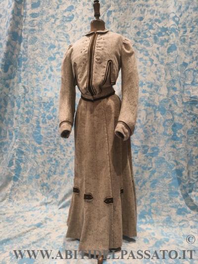 1900-1905:Abito realizzato in panno di lana di 2 tonalità differenti e velluto di seta, decorato da pizzo e arricchito da bottoni ricoperti. Il corpino, steccato, si chiude frontalmente mediante ganci. La gonna invece si chiude posteriormen...
