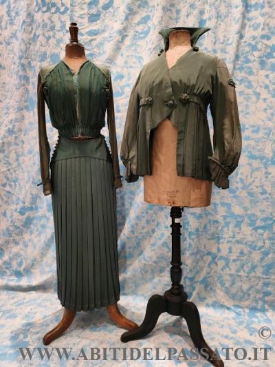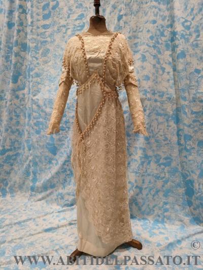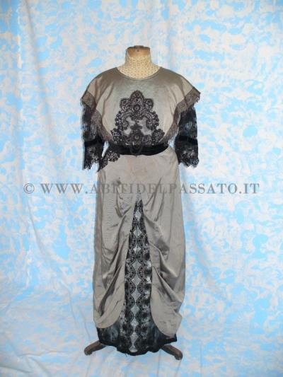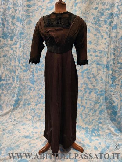 1913-1916 CIRCA, MANIFATTURA ITALIANA, ABITO DA SERA INTERO A MANICA LUNGA, REALIZZATO IN OTTOMAN DI SETA DI COLORE ROSA ANTICO, TULE DI SETA NERO, FODERA IN SETA, VELLUTO, NASTRI IN SETA, PASSAMANERIA RICAMATA CON PIETRE IN VETRO, SOUTACHE...