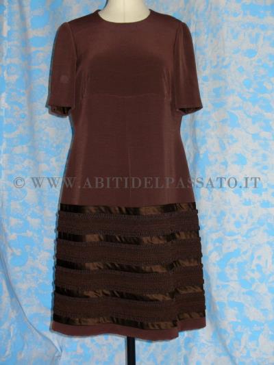 1962: ABITO INTERO REALIZZATO IN TESSUTO OPERATO DI SETA COLOR MARRONE, LA PARTE BASSA DELL'ABITO E' ARRICCHITA DA PASSAMANERIA E CORDONCINI IN SETA IN TINTA.
