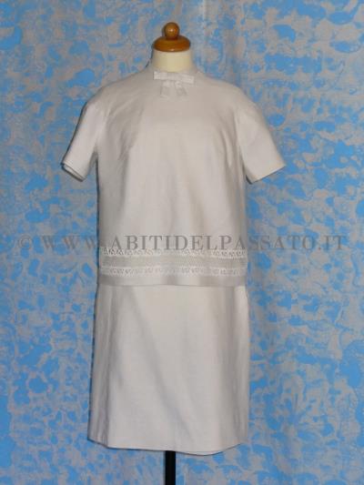 1969: ABITO DA SPOSA CORTO, REALIZATO IN LANA. PARTICOLARE LAVORAZIONE A PUNTO SMOK SUL DAVANTI E AI POLSI. DECORATO CON PASSAMANERIA IN SETA BIANCA E BLU A MOTIVI FLOREALI.