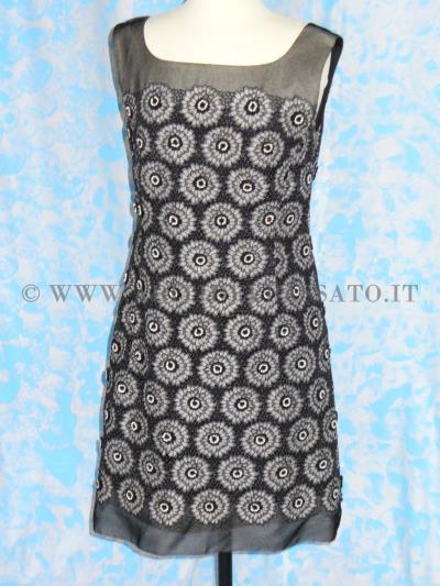 1961: ETICHETTA: ESDA MANIFACTURE, SWITZERLAND. ABITO INTERO DI FORMA A TRAPEZIO REALIZZATO IN TESSUTO RICAMATO MECCANICAMENTE A DISEGNO FLOREALE E ORGANZA DI SETA NEI TONI DEL BIANCO E NERO. AL CENTRO DI OGNI MARGHERITA E' STATA APPLI...