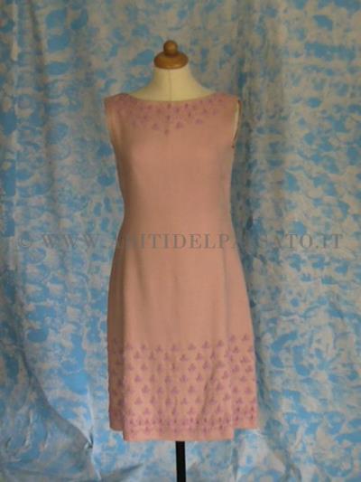 1961: ABITO DA SERA REALIZZATO IN TESSUTO MISTO LINO ROSA CONFETTO, RICAMATO NEL CARRE' E NELLA PARTE BASSA CON PERLINE E LOSANGHE DI VETRO, IN TONO.