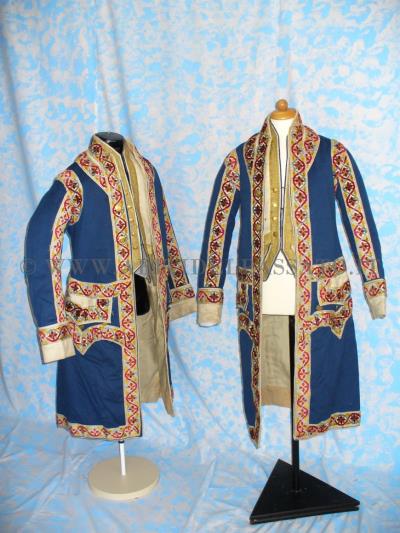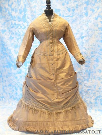1881: ETICHETTA: MARION E. DICK, M. WAVERY PLACE. NEW YORK. ABITO INTERO REALIZZATO IN RASO DI SETA NERO, BROCCATA IN LANA, A MOTIVI FLOREALI NEI TONI DEL ROSSO, GIALLO, VERDE, AZZURRO ( PURTROPPO ALCUNE PARTI DELLA BROCCATURA DI LANA SONO ...