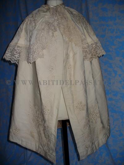 1899: SOPRABITO A MANTELLA,REALIZZATO IN TESSUTO DI LANA COLOR PANNA, ARRICHITO DA RICAMI ESEGUITI A MANO, CON DIVERSI TIPI DI PUNTO. QUASI SICURAMENTE L'ABITO IN OGGETTO E' UN RECUPERO DI UN ABITO DA SPOSA.