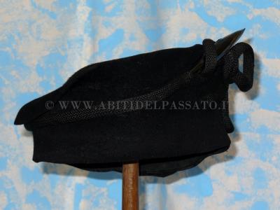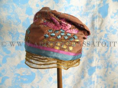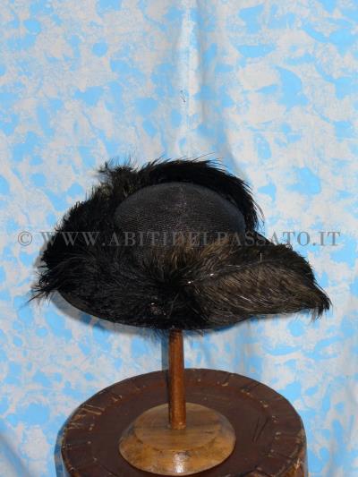 Cappello realizzato da struttura metallica e paglia, rivestita in velluto nei colori dell'avorio e del nero(per il sottotesa), fodera della callotta in raso di seta, un cordone ...