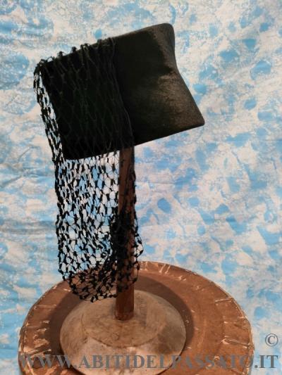 1940: MANIFATTURA ITALIANA, PROVENIENZA CITTA' DI BOLOGNA. CAPPELLO DA CERIMONIA REALIZZATO IN PANNO DI LANA, DECORATO DA RETINA RACCOGLI CHIGNON CON ELASTICO PASSANTE. L'ESEMPLARE, FU UTLIZZATO NEL FEBBRIO DEL 1940 DALLA PROPRIETARIA,...