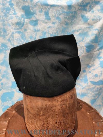 CAPPELLO, REALIZATO IN LANA ALL'UNCINETTO, DECORATO DA GRANDE FIOCCO IN VELLUTO DI COTONE, IL COPRICAPO E' STATO REALIZZATO COME RICHIEDEVA LA MODA DEL TEMPO, A MO DI TURBANTE, ...
