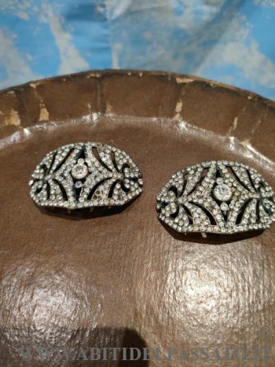 1890 CIRCA, MANIFATTURA ITALIANA, COPPIA DI FIBBIE DA SCARPE, REALIZZATEE IN METALLO E DECORATE DA PIETRE IN VETRO. MANCANTI DI QUALCHE PIETRA, NEL COMPLESSO LE CONDIZIONI SONO ECCELLENTI.