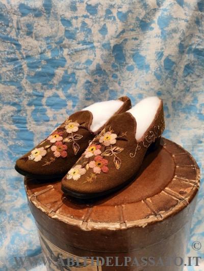 1905-1910: MANIFATTURA ITALIANA, PIEMONTE, CALZATURE FEMMINILI REALIZZATE IN FELTRO DI LANA COLOR MUSCHIO, RICAMATE A MANO IN FILATI DI LANA COLORATI, CON VARI TIPI DI PUNTO ( punto spugna, punto vapore, punto erba, cordoncino). CONDIZ...