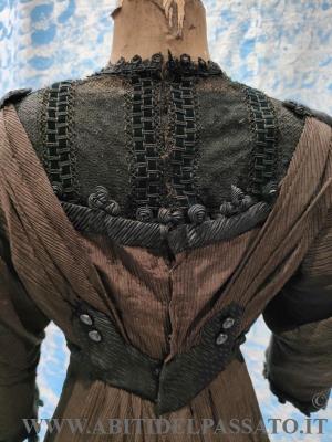APERTURA POSTERIORE MEDIANTE GANCI E AUTOMATICI. SCOLLATURA A GIRO, CARRE' IN TULLE OPERATO E DECORATO DA PASSAMANERIA. CORPETTO STECCATO E FODERATO IN TAFFETAS DI SETA.