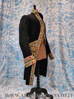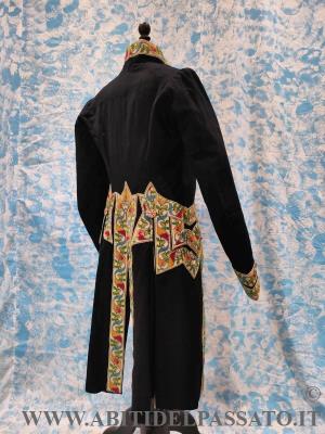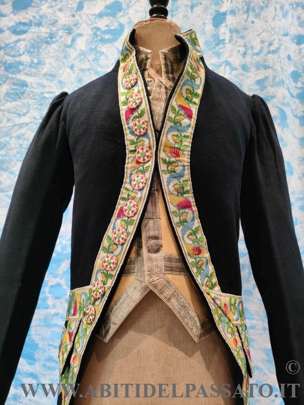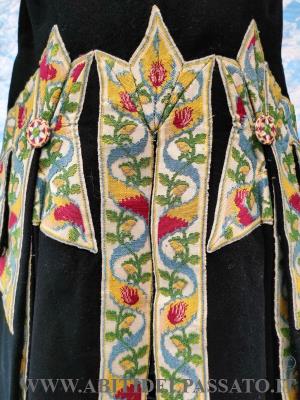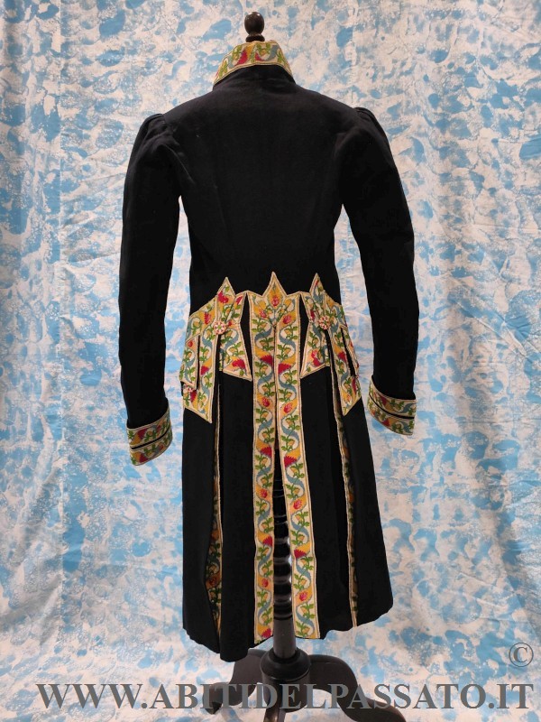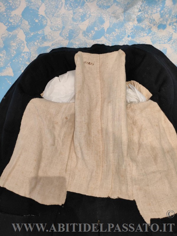 IL CAPO E' REALIZZATO IN PANNO DI LANA DI COLORE BLU E DECORATO DA PASSAMANERIA, BOTTONI RICAMATI CON FILATI DI SETA DEGLI STESSI COLORI DELLA PASSAMANERIA. FODERA IN LINO.