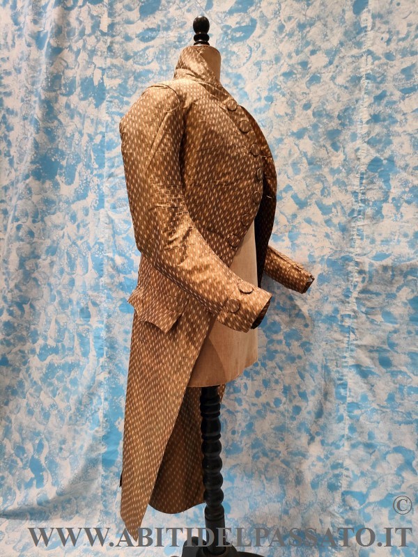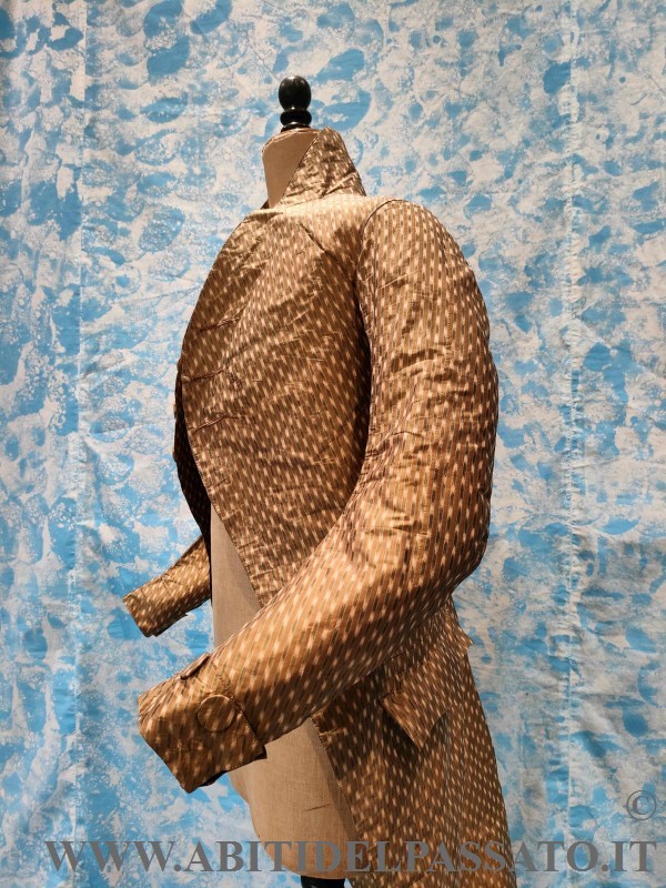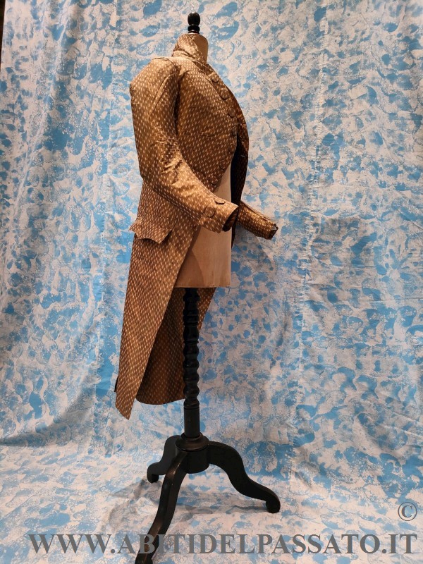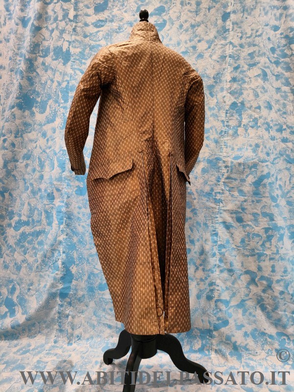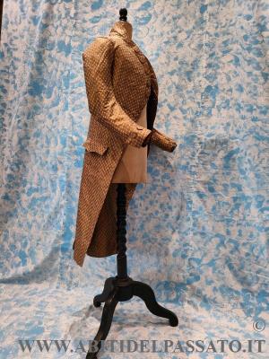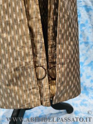 SI PRESENTA CON ALTO COLLO A FASCETTA VERTICALE, MANICHE SAGOMATE ED ADERENTI CON PARAMANI ARRICCHITI DA 2 BOTTONI FASCIATI, MOSTRE ARROTONDATE GUARNITE DA DIECI BOTTONI, CORRISPONDENTI A TRE ASOLE. TASCHE A PATTA SAGOMATA SENZA BOTTONI. SPACCO POSTERIORE REALIZZATO CON DOPPIO PIEGONE E PUNTO VITA SEGNATO DA DUE BOTTONI. FODERA IN TAFFETAS DI SETA. IL CAPO NON E' MAI STATO INDOSSATO.