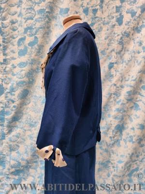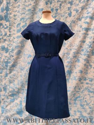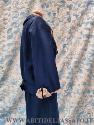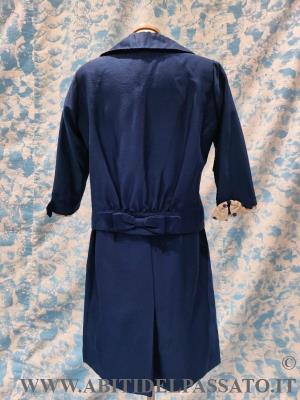 COMPLETO DA CERIMONIA, REALIZZATO IN TESSUTO DI LANA E SETA DI COLORE BLU CERULEO, COMPOSTO DA ABITO INTERO, CINTURA, GIACCA E SCIARPA.