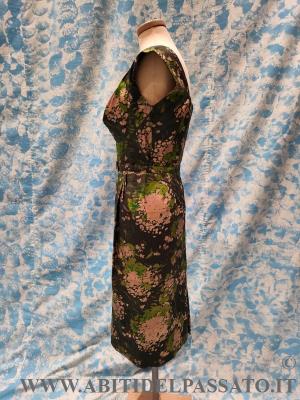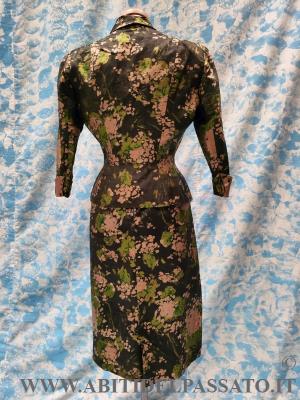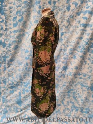 DELIZIOSO COMPLETO DA GIORNO, REALIZZATO IN SCHANTUNG DI SETA, CON STAMPA A FIORI, NEI TONI DEL GRIGIO, ROSA ANTICO E VERDE ACIDO, COMPOSTO DA ABITO INTERO SENA MANICHE, CINTURA E GIACCA CORTA.