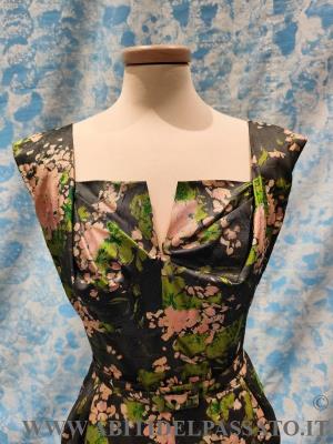 ABITO SENZA MANICHE, CON SCOLLATURA QUADRATA E MOTIVO AD ORIGAMI NELLO SFOGO DEL SENO. CHIUSO POSTERIORMENTE DA LUNGA ZIP. COMPLETA L'INSIEME LA CINTURA, RIVESTITA NELLO STESSO TESSUTO.