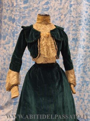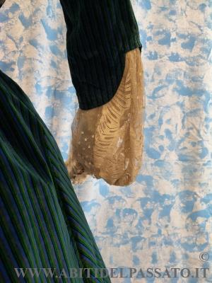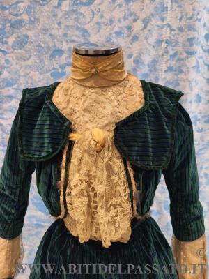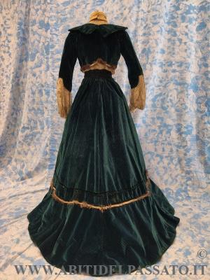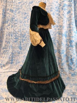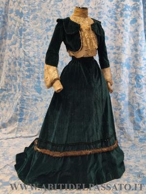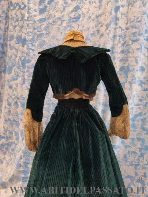 SPLENDIDO ABITO DA GIORNO O DA PASSEGGIO, INVERNALE, COMPOSTO DA CORPINO, GONNA E COLLETTO STACCABILE, REALIZZATO IN VELLUTO DI SETA STAMPATO A RIGHE DI COLORE VERDE SMERALDO, BLU CERULEO, ROSSO MATTONE E NERO, MERLETTO MECCANICO, TULLE PLUMETIS, RASO DI SETA, FODERE IN TAFFETTAS DI SETA CANGIANNTE VERDE-BLUE, NASTRI DI VELLUTO, BORDI IN PELLICCIA.
