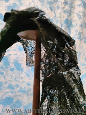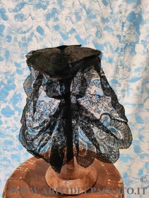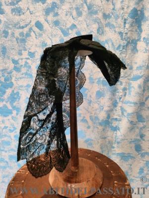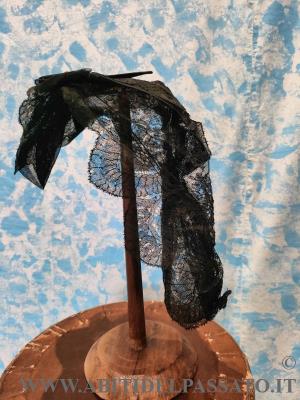 1870-1880 CIRCA, MANIFATTURA ITALIANA, PROVENIENZA CITTA' DI BERGAMO, PER QUESTA CUFFIA DA CASA, REALIZZATA IN PIZZO NERO. UN ELASTICO PER BLOCCARLA ALLO CHIGNON E' POSTO NELLA PATE POSTERIORE. MENTRE UN FIOCCO DECORATIVO E' POSTO NELLA PARTE CENTRALE.