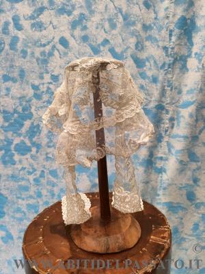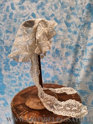1870-1880 CIRCA, MANIFATTURA ITALIANA, PROVENIENZA CITTA' DI BERGAMO, PER QUESTA CUFFIA DA CASA, REALIZZATA IN MERLETTO MECCANICO DI COLORE BIANCO. UN ELASTICO PER BLOCCARLA ALLO CHIGNON E' POSTO NELLA PARTE POSTERIORE.