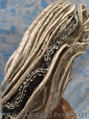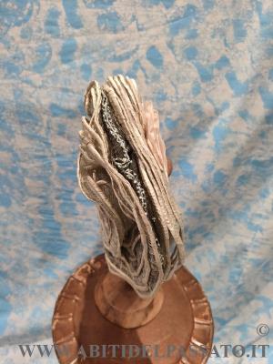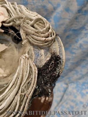 ELEGANTE E RAFFINATO CAPPELLO, COSTRUITO SU UNA BASE DI FILATO METALLICO, RIVESTITO DA CRINE, FODERATO DA TULLE E CHIFFON DI SETA, TUTTO DI COLORE BIANCO. DECORATO DA GRANDI ROSE IN SETA, CORDONE, FILATI E APPLICAZIONI METALLICHE E DA CORDONE DI PAGLIA RIVESTITO IN RAFFIA E PASSAMANERIA.