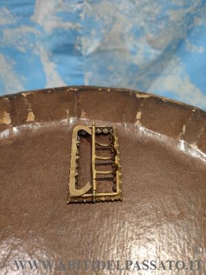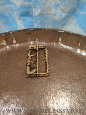 FIBBIA (una soltanto) DA SCARPA, REALIZZATA IN METALLO DORATO (possibile ottone) E ARRICCHITA DA PIETRE CASTONE IN VETRO.