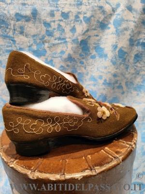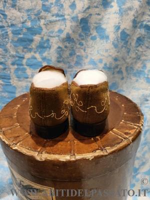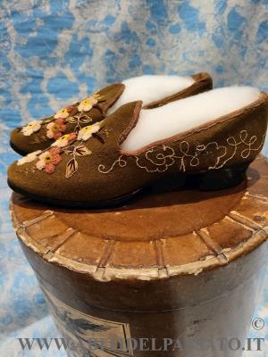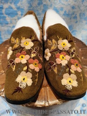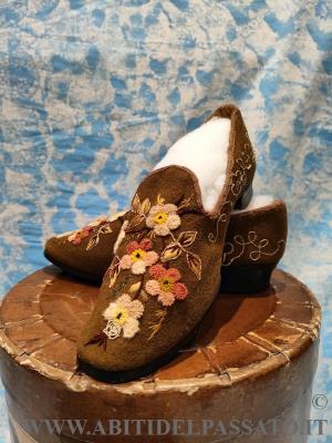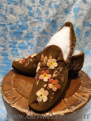 1905-1910: MANIFATTURA ITALIANA, PIEMONTE, CALZATURE FEMMINILI REALIZZATE IN FELTRO DI LANA COLOR MUSCHIO, RICAMATE A MANO IN FILATI DI LANA COLORATI, CON VARI TIPI DI PUNTO ( punto spugna, punto vapore, punto erba, cordoncino).